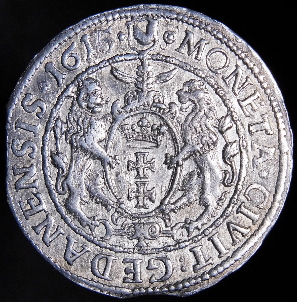 Renesansowa tarcza z herbem Gdańska podtrzymywana przez dwa lwy na rewersie.