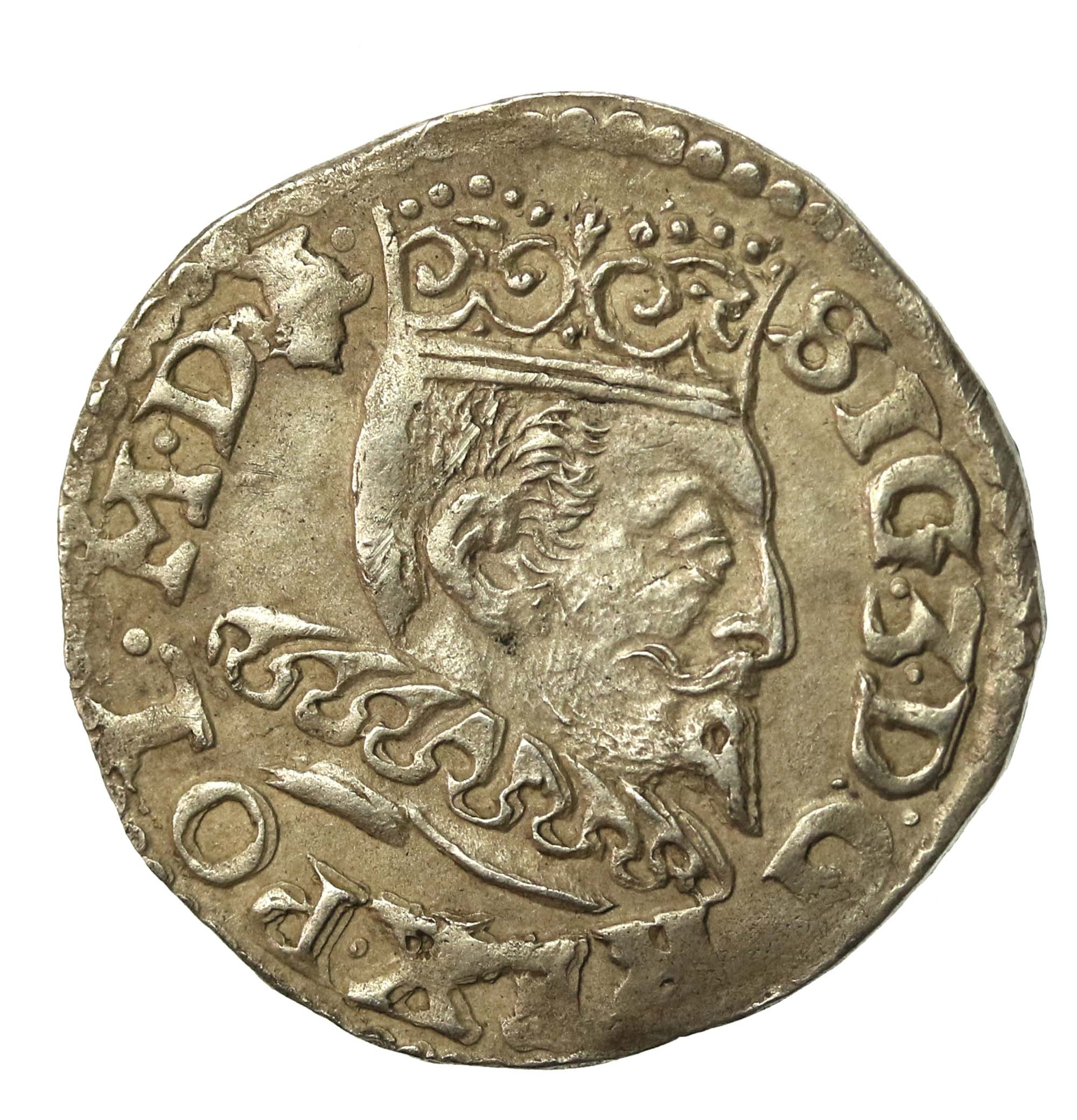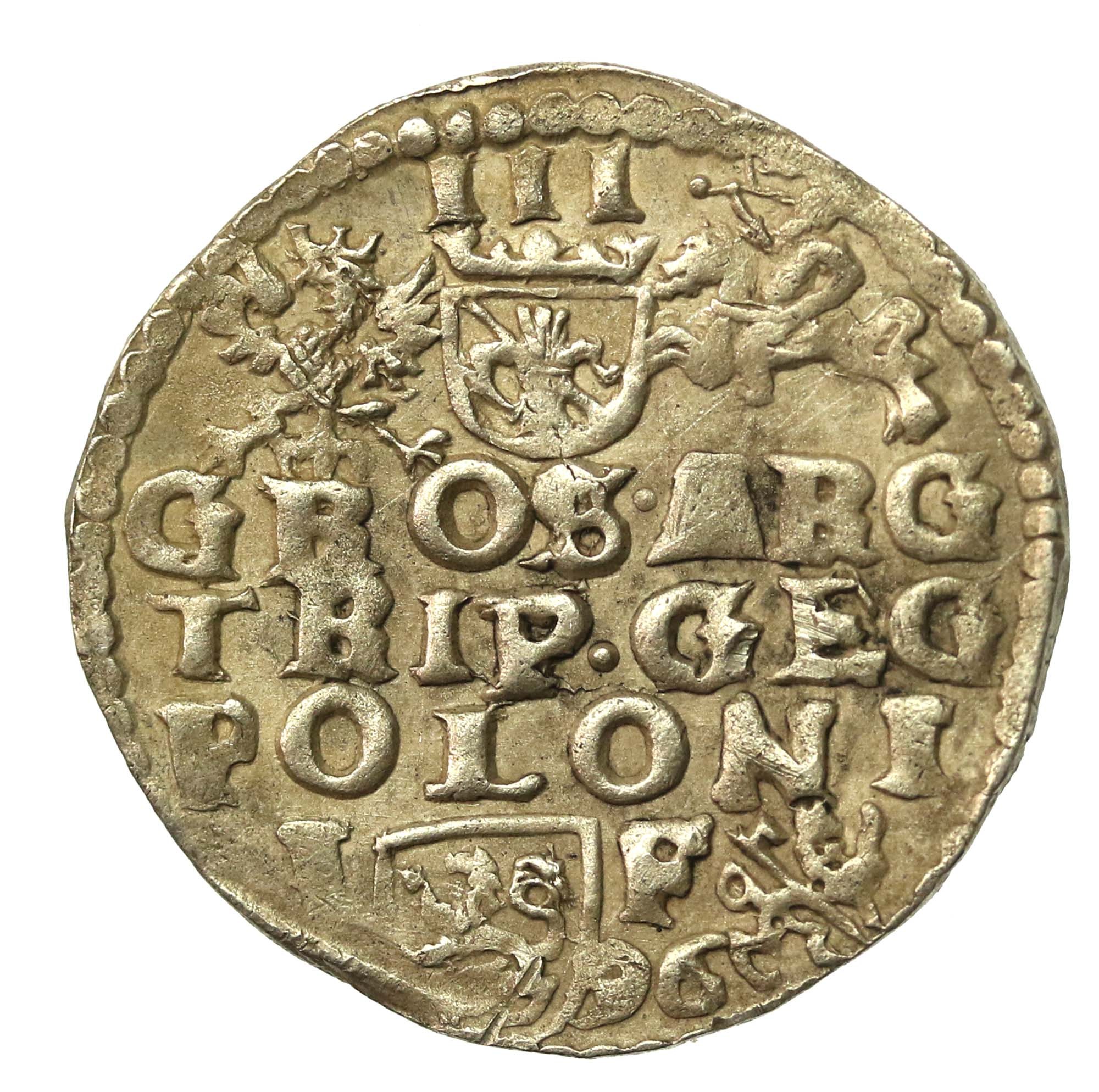 Zygmunt III Waza, Trojak Lublin 1596 - data nierozdzielona. Odmiana ze znakiem mincerskim - lwem przebitym hakiem, rozdzielającym skróconą datę. Stan zachowania: 2/2-. Literatura: Iger L.96.5.c
