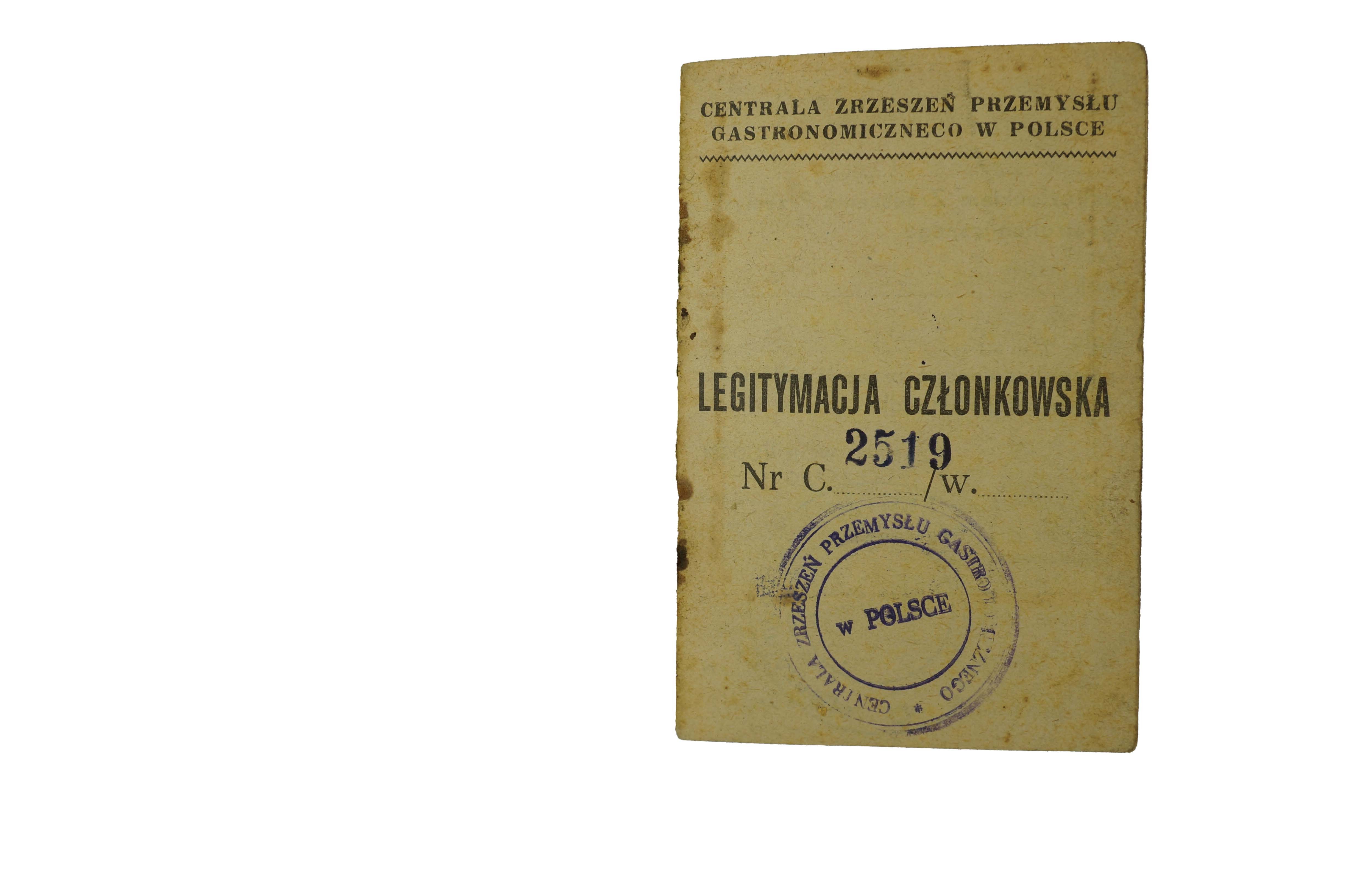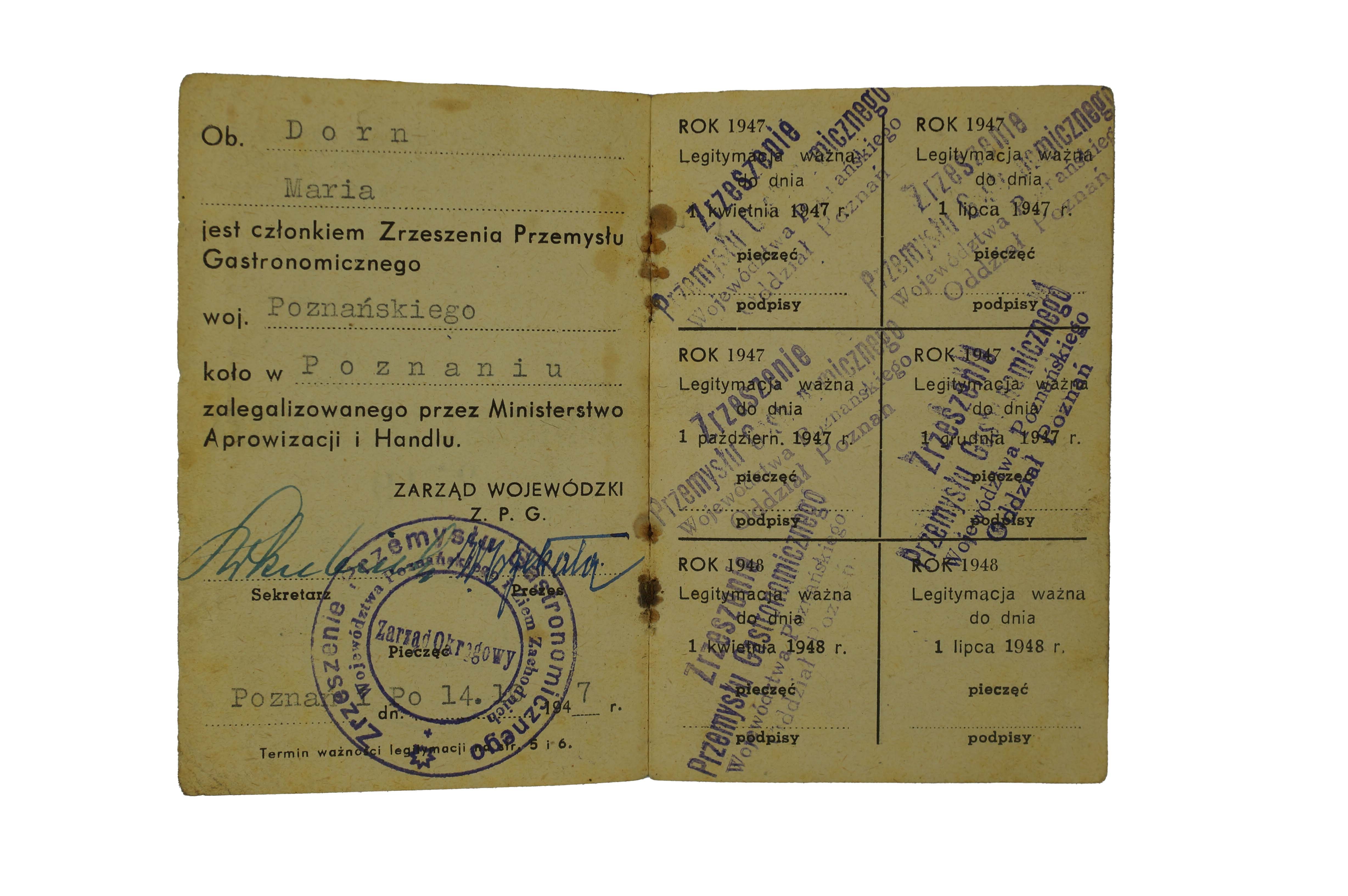 Centrala Zrzeszeń Przemysłu Gastronomicznego w Polsce LEGITYMACJA Maria Dorn, 1947r., f. 7x10,5cm, s. 8