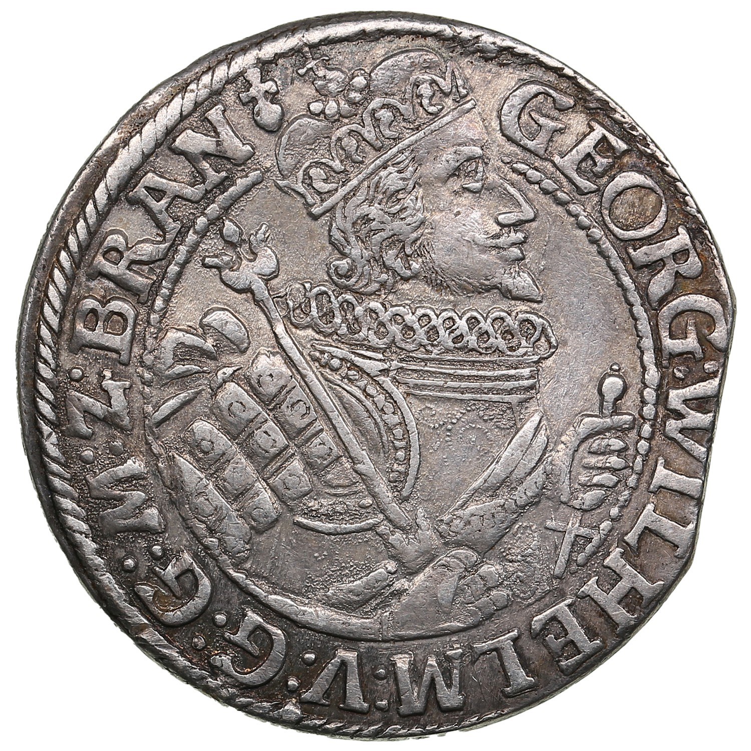 Obv.: Crowned and cuirassed half-length bust of Georg Wilhelm to right, holding scepter and hilt of the sword; “GEORG:WILHELM:V:G:G:M:Z:BRAN (mintmaster’s mark: cross on heart)” – “Von Gottes Gnaden Markgraf zu Brandenburg”.