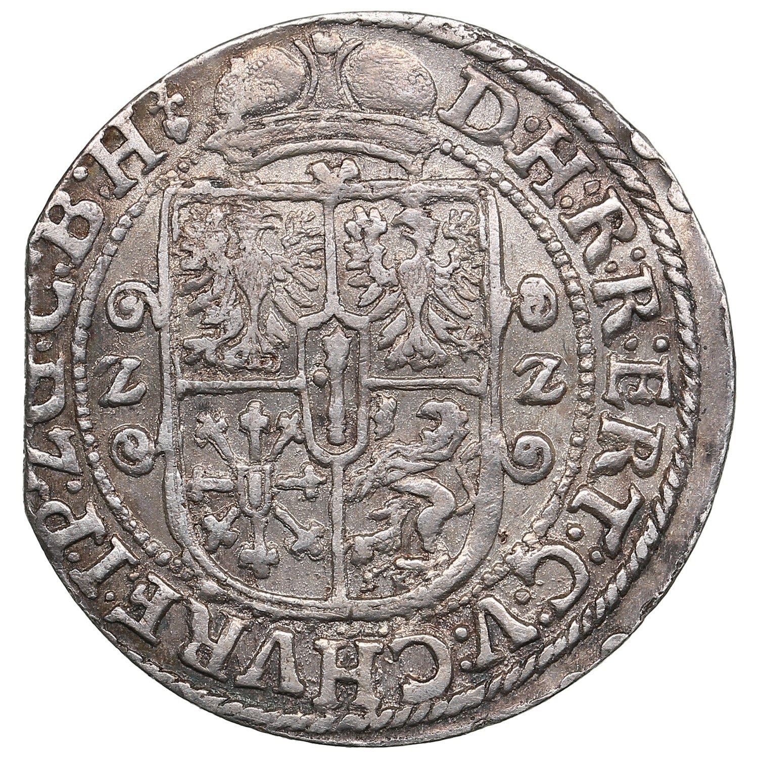 Rev.: Crowned shield bearing the quartered arms of Brandenburg, Prussia, Cleves and Jülich, Elector's scepter at center; (16)Z-Z across field, “D:H:R:R:ERT:C:V:CHVRF:I:P:Z G:G:B:H (mintmaster’s mark: cross on heart)” – “Des Heiligen Römischen Reichs Ertz Cämmerer und Churfürst in Preussen, zu Gülich, Cleve, Berg Herzog”.