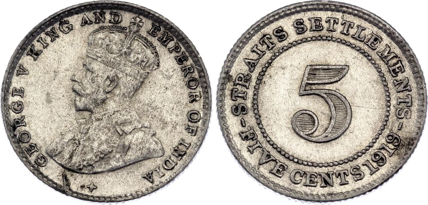 Straits Settlements 5 Cents 1919 Planchet Flaw Error