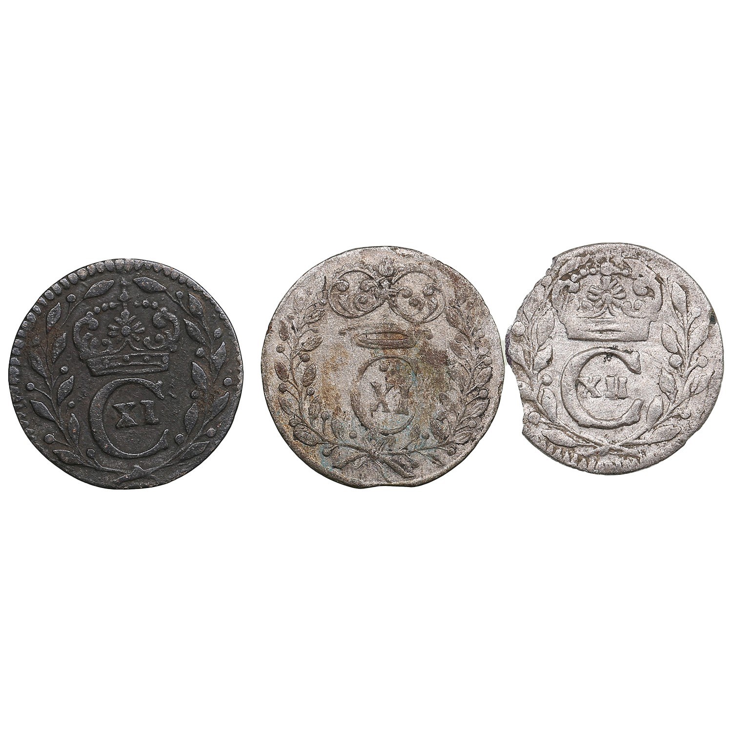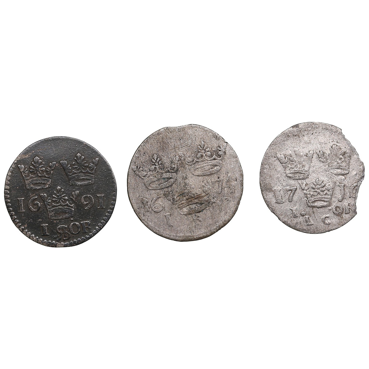 Various condition. 1 Öre 1674, 1691 - Karl XI (1660-1697). KM 250, 250a. 1 Öre 1710 - Karl XII (1697-1718). KM 250a.