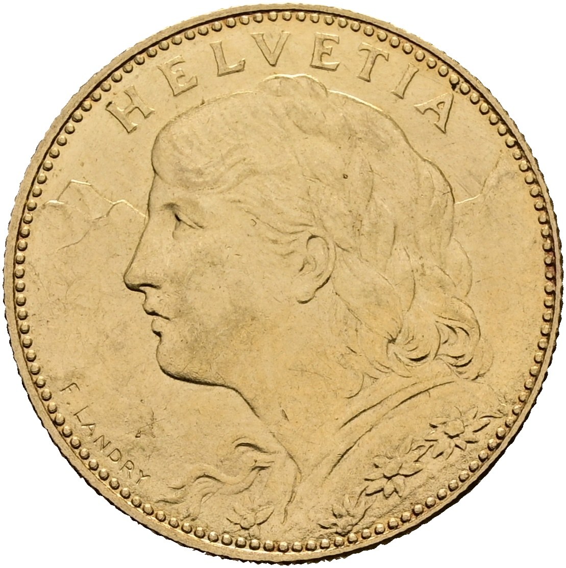 Goldmünze 10 Franken Vreneli 1911. Der seltenste Jahrgang der Serie mit einer Auflage von nur 100'000 Exemplaren / The rarest year of the series, with a mintage of only 100,000 pieces.