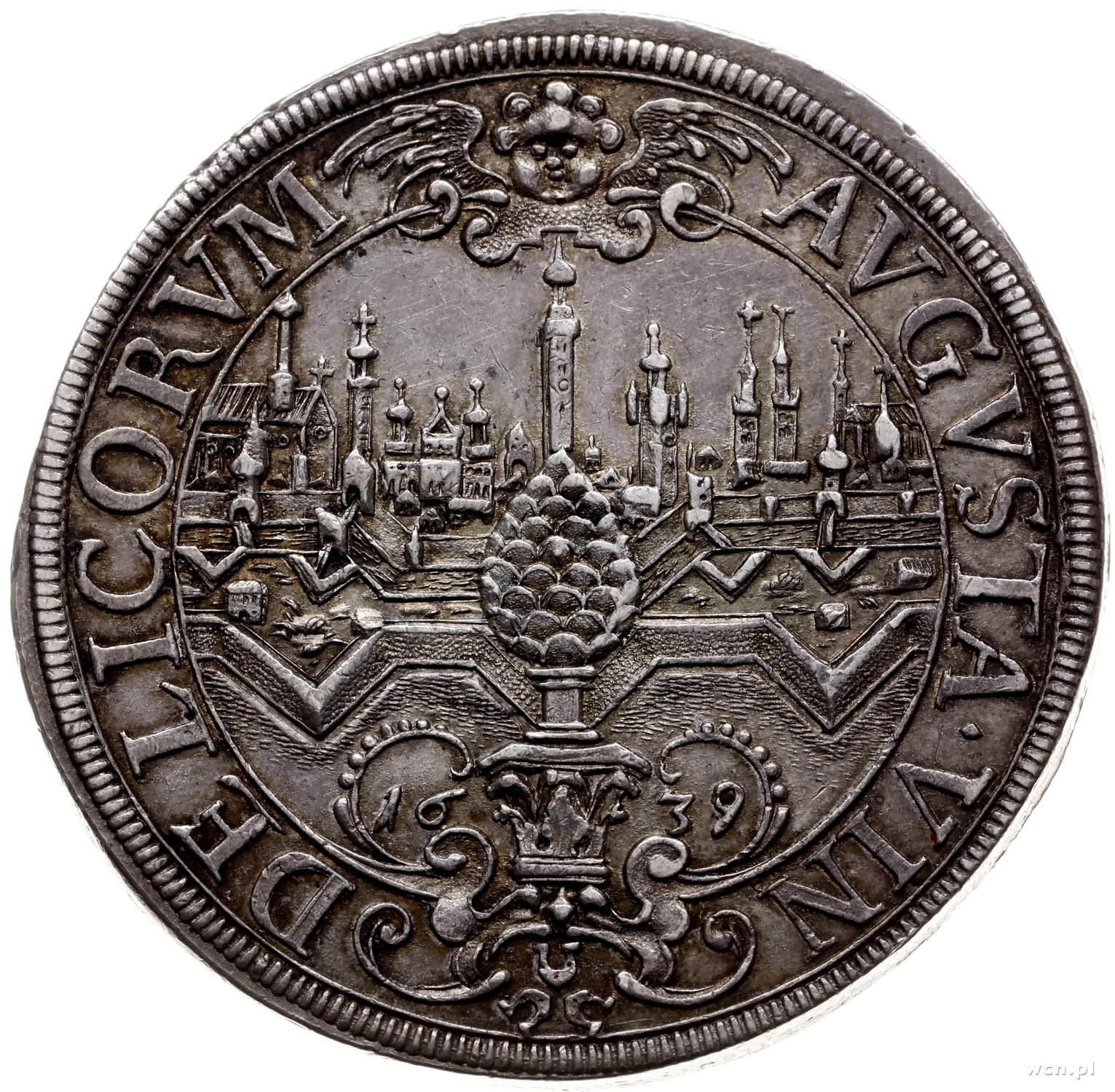 Augsburg - miasto, talar 1639; moneta z tytulaturą Ferdynanda III, Aw: Popiersie w prawo i napis w otoku, Rw: Widok miasta, u dołu data, wokoło napis; Dav. 5039; srebro 28.70 g; dwie ryski na awersie, ładna, stara patyna