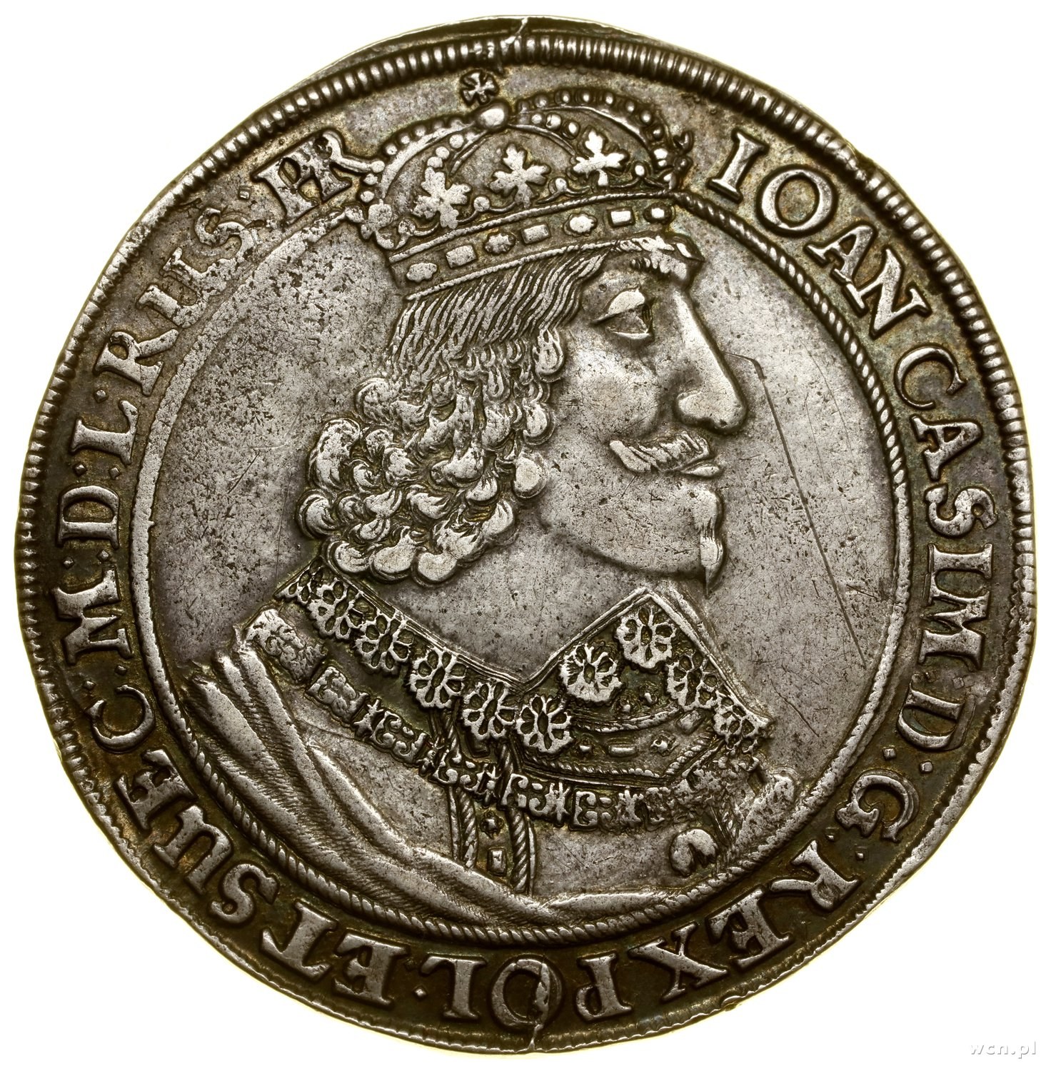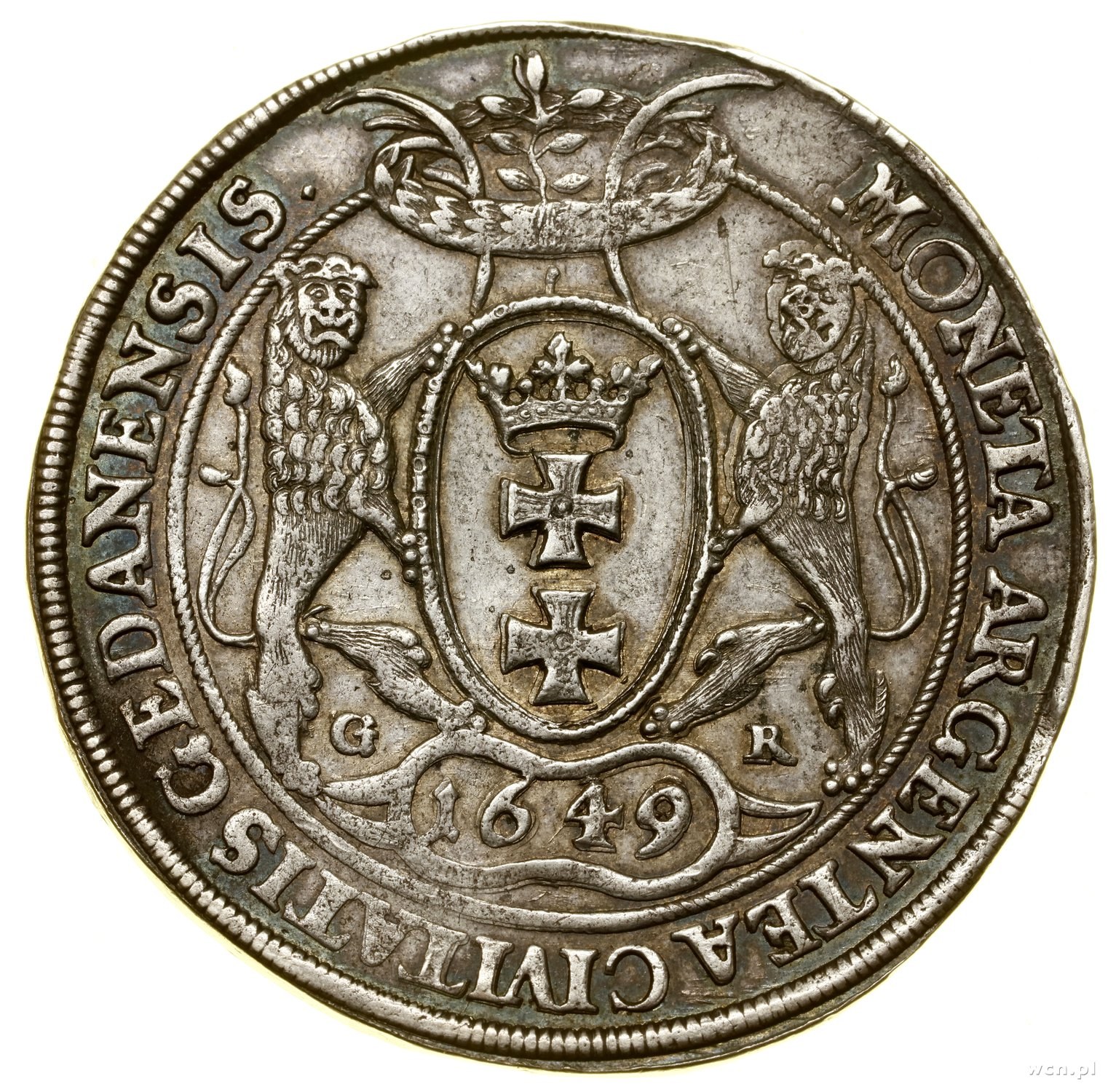 miasto Gdańsk, Talar, 1649, Gdańsk; Aw: Popiersie władcy w prawo, IOAN CASIM D G REX POL ET SUEC M D RUS PR; Rw: Herb wielki Gdańska, poniżej litery G - R (inicjały Gerharda Rogge, dzierżawcy mennicy w Gdańsku), MONETA ARGENTEA CIVITATIS GEDANENSIS; CNG 300.Ia, Davenport 4358, Dutkowski Talary G.07 (R5), Kop. 7641 (R2), Kurp. (1649–1696) 892 (R); srebro, 28.79 g; mała rysa na awersie, ale ładnie zachowany.