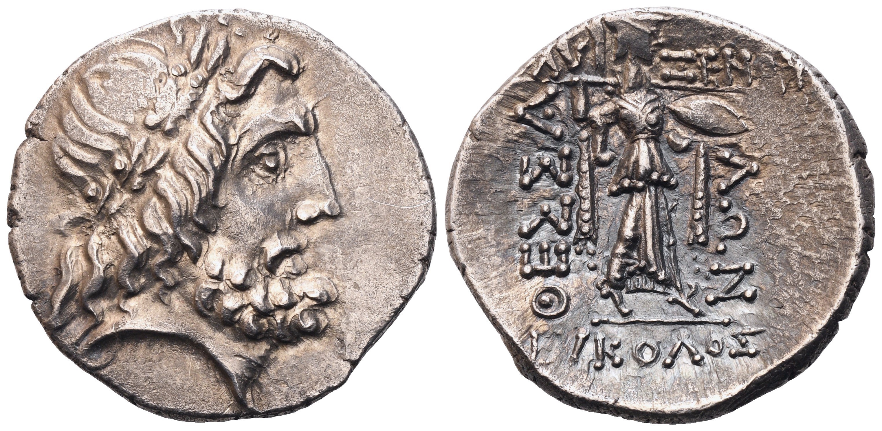 Bearded head of Zeus r.; Rv. ΘEΣΣAΛΩN / [ΠΟ]ΛYΞENOY - EYKOΛOΣ Athena Itonia striding right, hurling spear with her right hand and holding shield on her left arm. BCD Thessaly I 1390. BCD Thessaly II 878.2. Helly 1966, 2. HGC 4, 210. SNG Copenhagen 291. Near extremely fine / extremely fine. Pleasing old cabinet tone.