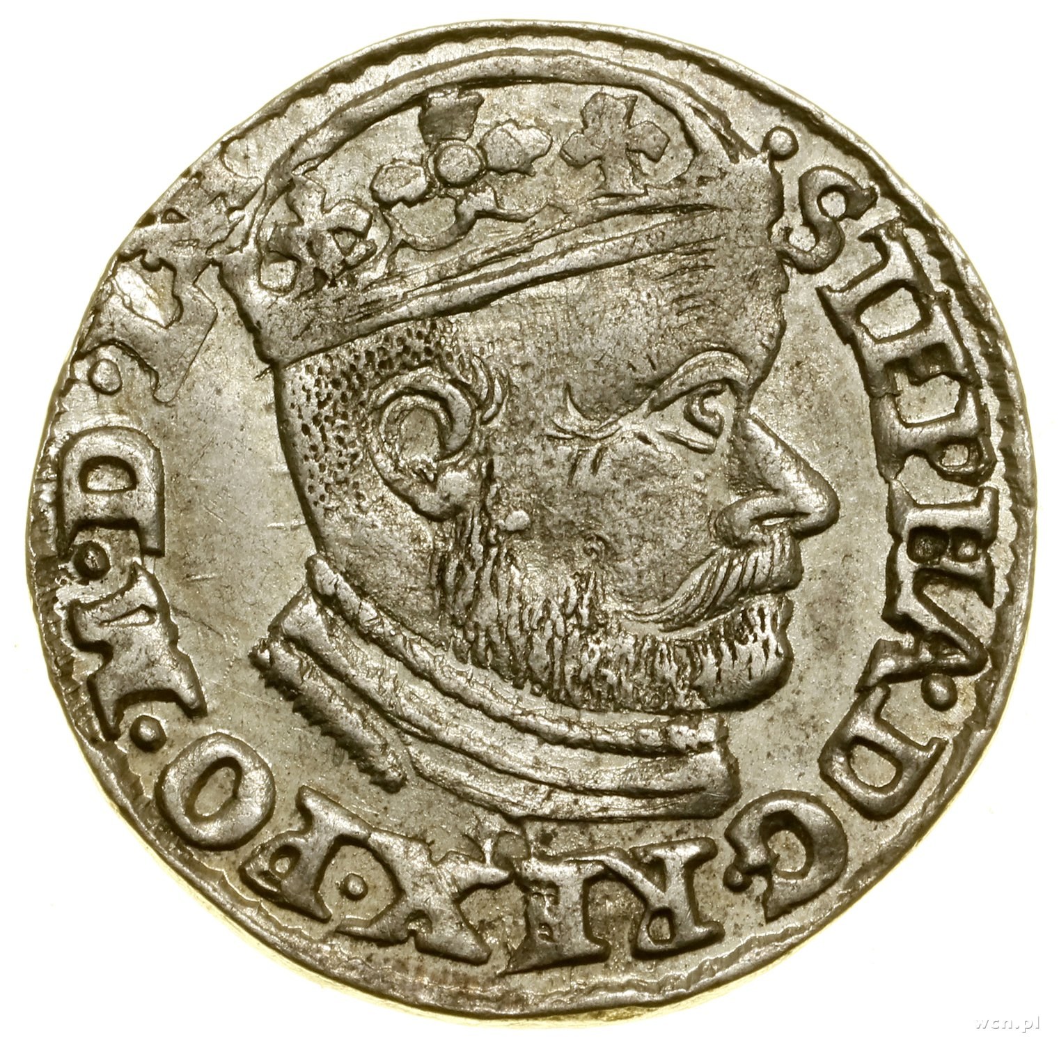 monety koronne, Trojak, 1586, Olkusz; odmiana z ligaturą NH (Mikołaj Hevel de Colpino, zarządca mennicy) na końcu legendy awersu; Iger O.86.2.b (R2), Kurp. (1576–86) 199 (R1), Parchimowicz Trojaki 81.a2; pięknie zachowany.