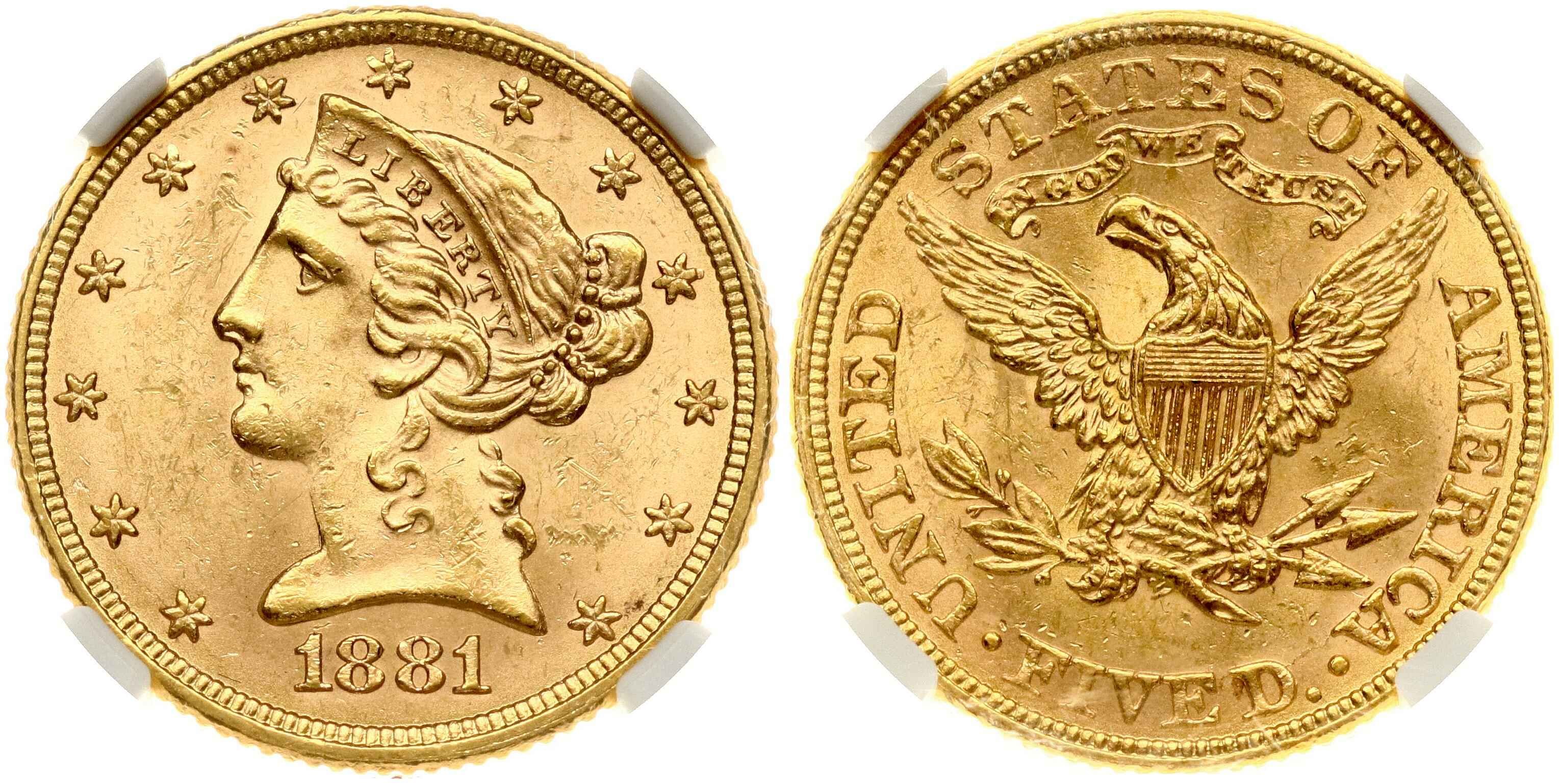 USA. 5 Dollars 1881, Philadelphia Liberty Head. Gold 8.35 g. Fr. 143; KM 101. NGC MS 63