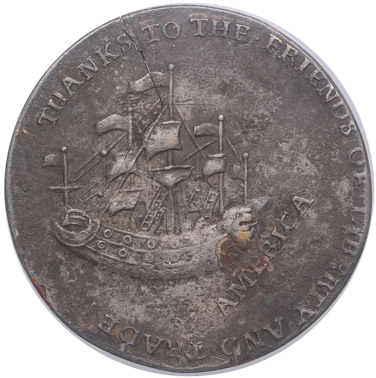 Environmental damage. Cracked Plachet. Silvered.Obv.: wigged bust of William Pitt to left. / Rev.: sailing ship left, AMERICA beneath stern.