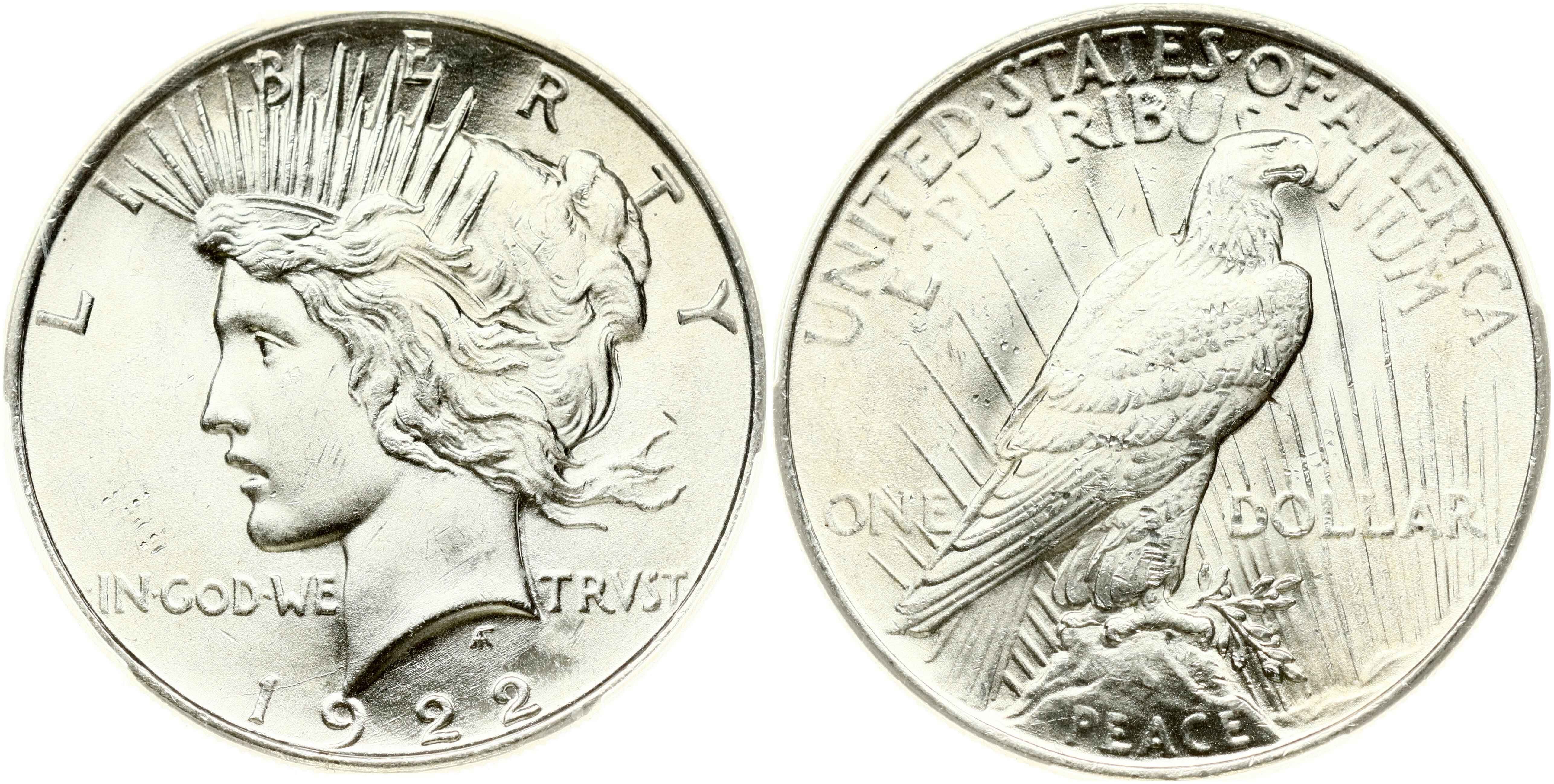 USA 1 Dollar 1922 'Peace Dollar' Philadelphia. Obverse: Capped head of Liberty left; headband with rays. Lettering: LIBERTY IN GOD WE TRUST. Reverse: Eagle standing right on rock wings folded; seen from the back; branch in talons; rays behind; PEACE below. Lettering: UNITED STATES OF AMERICA E PLURIBUS UNUM ONE DOLLAR PEACE. Edge Reeded. Silver. KM 150. PCGS MS 64