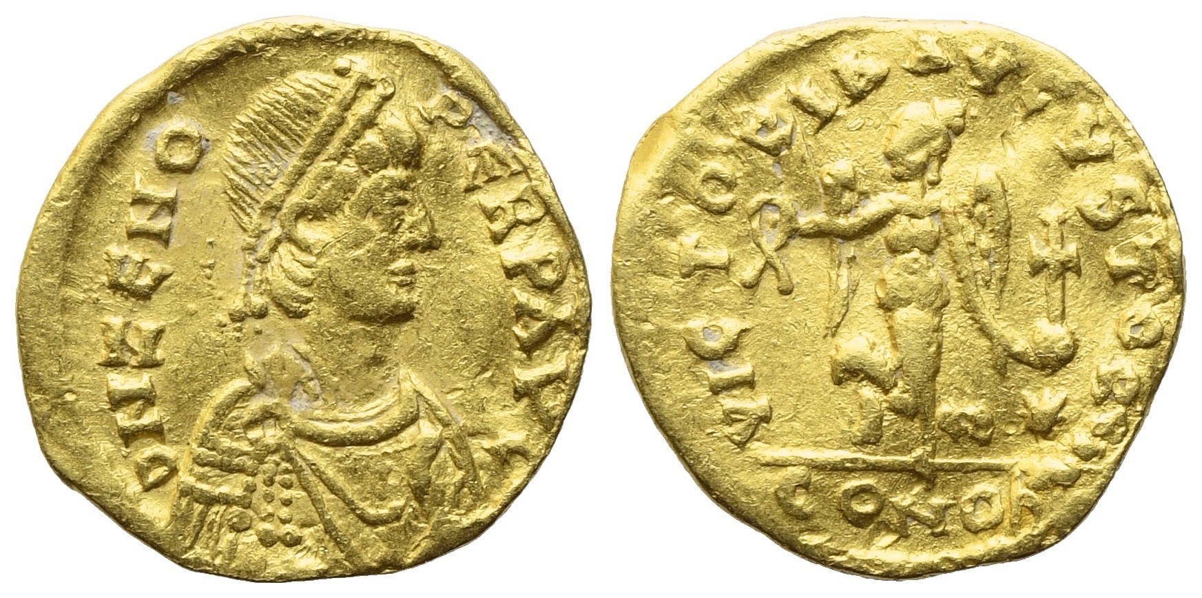 D N ZENO PERP AVG, pearl-diademed, draped and cuirassed bust of Zeno to right; Rv./ VICTORIA AVGVSTORVM, Victory advancing to front, head to right, holding wreath in right hand and globus cruciger in left; star in right field, CONOB in exergue. RIC X 914. gVF