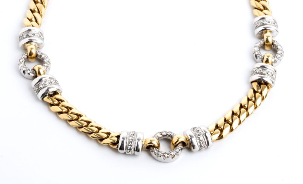 yellow gold curb chain, white gold diamond connection rings and ribbons.