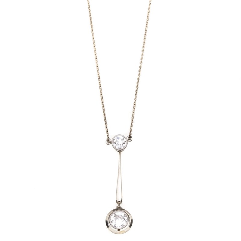 okres międzywojenny, złoto pr. 0,585, 1 szt. diament ~ 0,63 ct G/VS1, 1 szt. diament ~ 0,53 ct I/VS2, masa: 3,99 g; wym. zawieszki: 3 x 1 cm; dł.: 42 cm