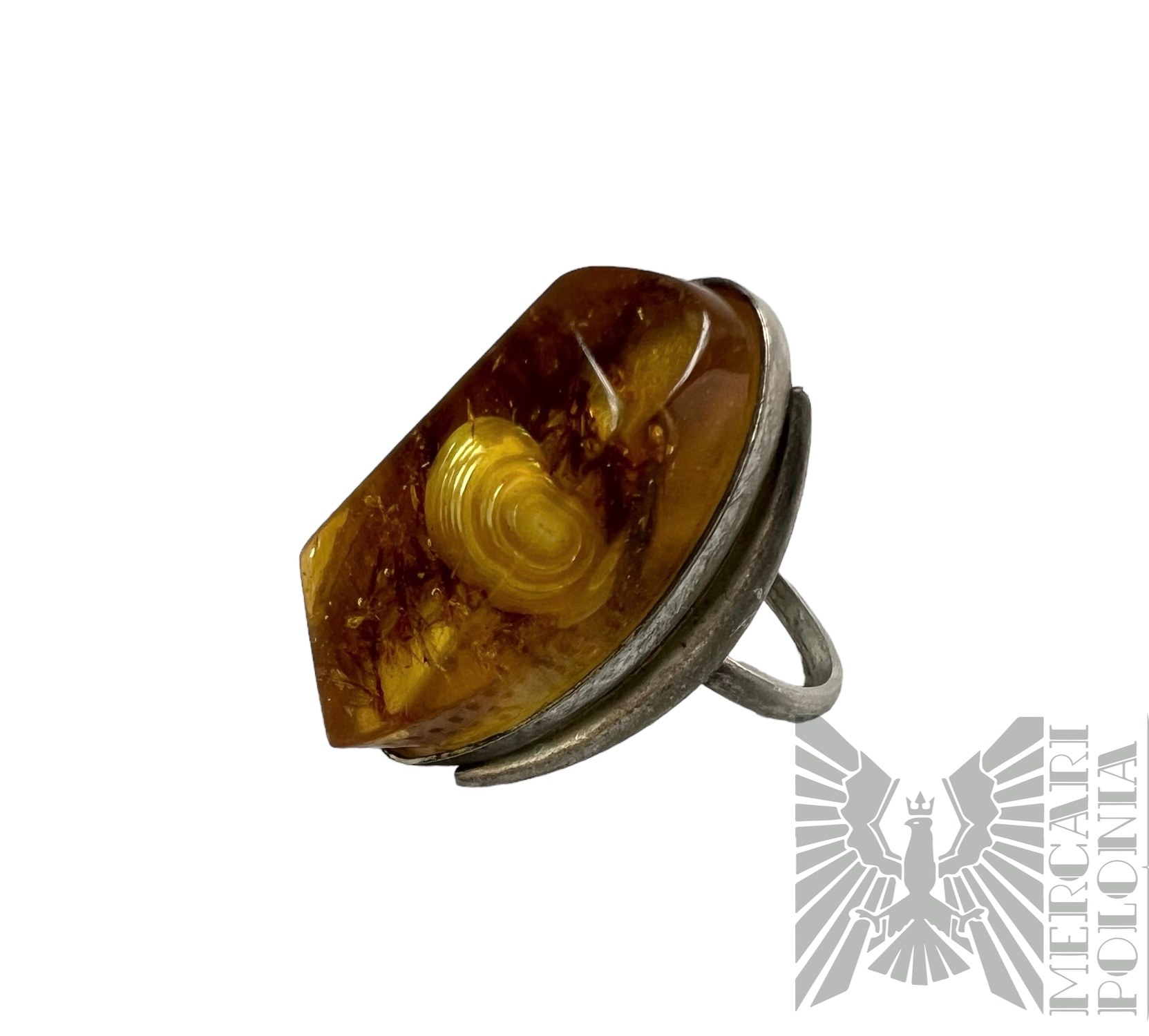Aluminiowy pierścionek w bursztynowym stylu, wewnątrz widoczna zatopiona muszelka. Stan pierścionka widoczny na zdjęciach.