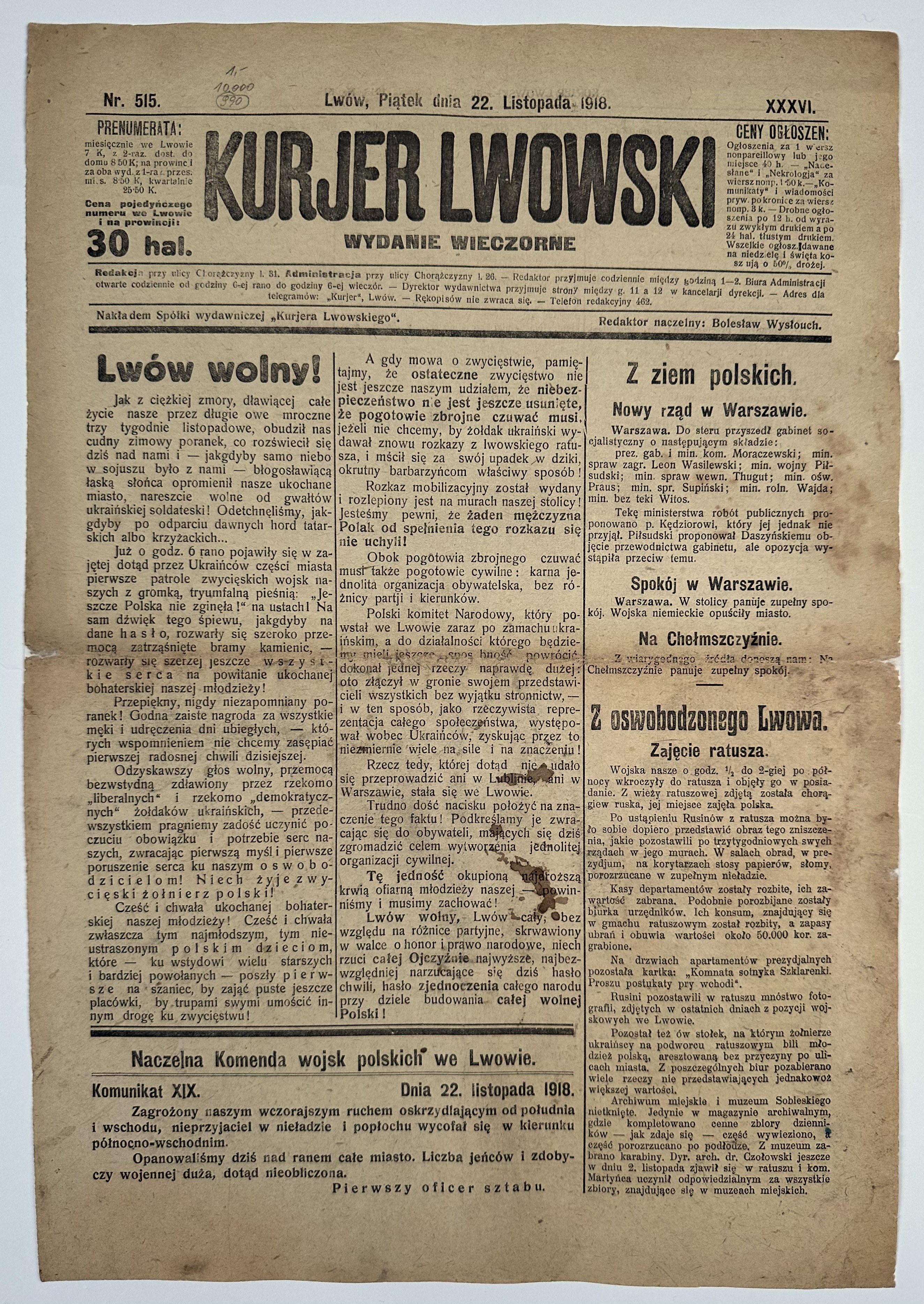 Bitwa o Lwów] "Lwów wolny!" Kurjer Lwowski Wydanie wieczorne z dnia 22 listopada 1918 r. Nr. 515. Rok XXXVI. Nakładem Spółki wydawniczej ""Kurjera Lwowskiego". Redaktor odpowiedzialny: Roman Marjan Antonik.