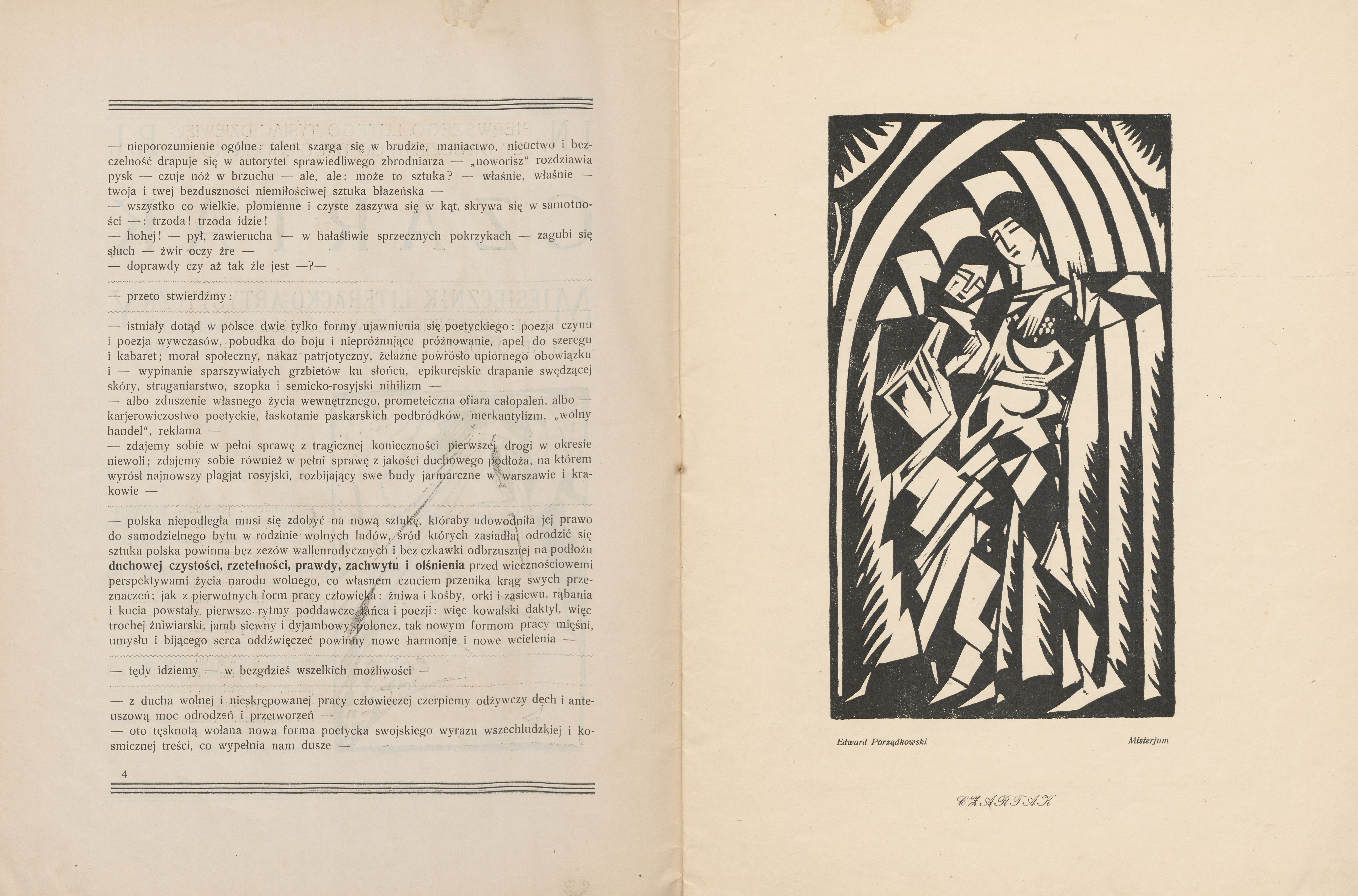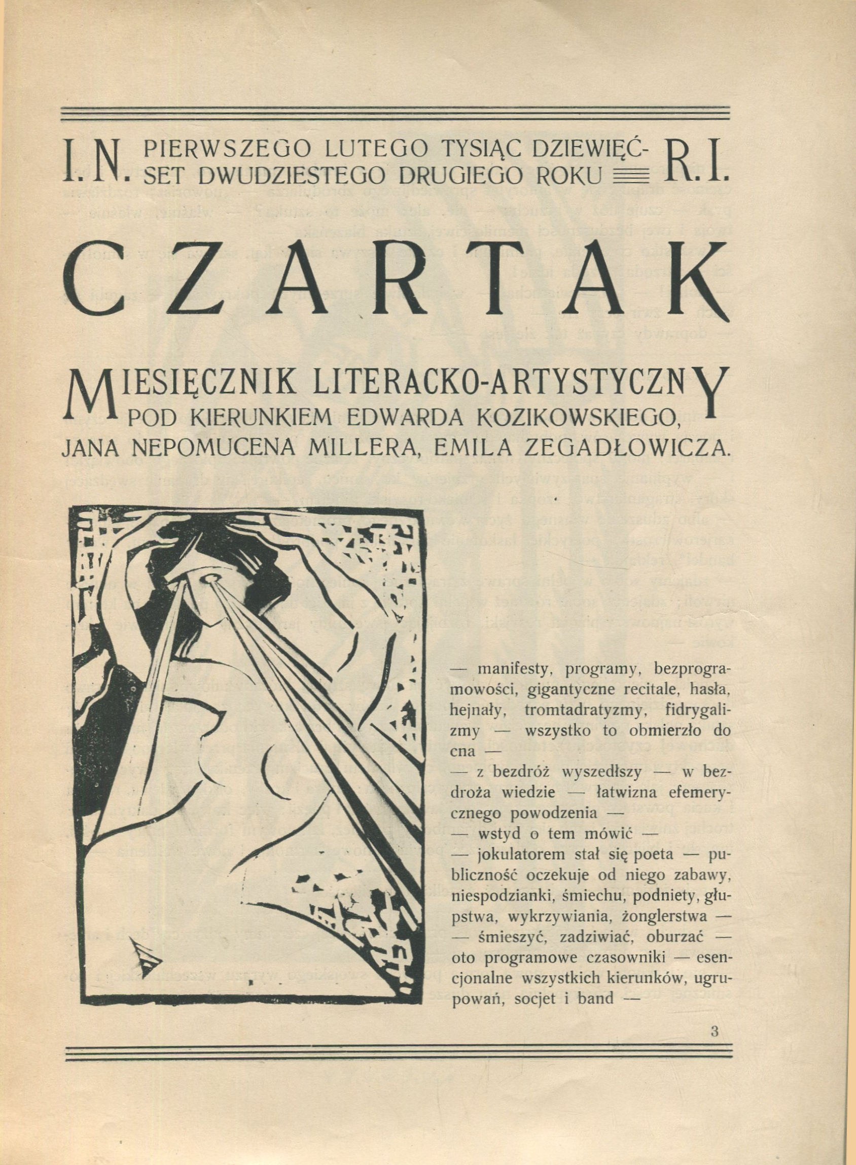 Pierwszy z trzech numerów Czartaka, miesięcznika literacko-artystycznego grupy literackiej Czartak, założonej w Wadowicach przez Emila Zegadłowicza, aktywnej w latach 1922-1928. Głosiła ona program oparty na mistyce religijnej, kulcie natury oraz idealizacji człowieka prostego, żyjącego w jej bliskości (w duchu franciszkańskim). Czerpała inspiracje z ekspresjonizmu, a swoją twórczość silnie osadzała w kulturze i pejzażu Beskidów, podkreślając znaczenie wątków regionalnych.