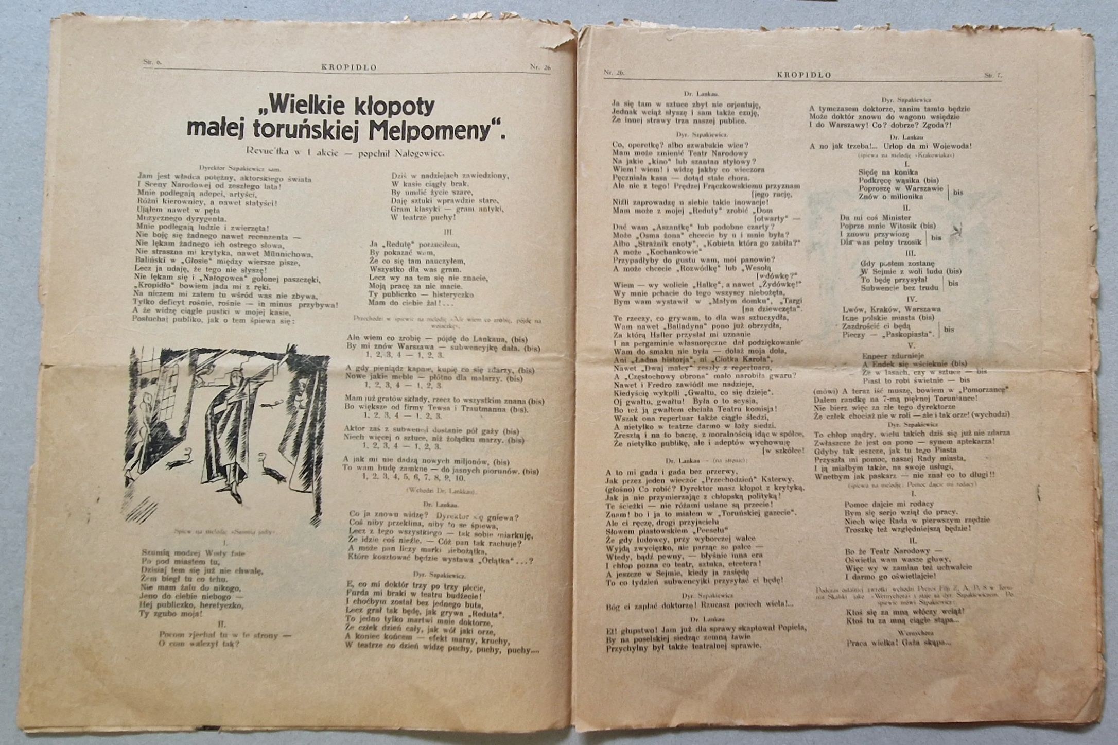 Cały numer poświęcony sprawom teatralnym. Na s.6 - 13 „Wielkie kłopoty małej toruńskiej Melpomeny.” Revue'tka w 1 akcie - popełnił Nałogowiec. Ilustracje do tekstu w stylu formistycznym.