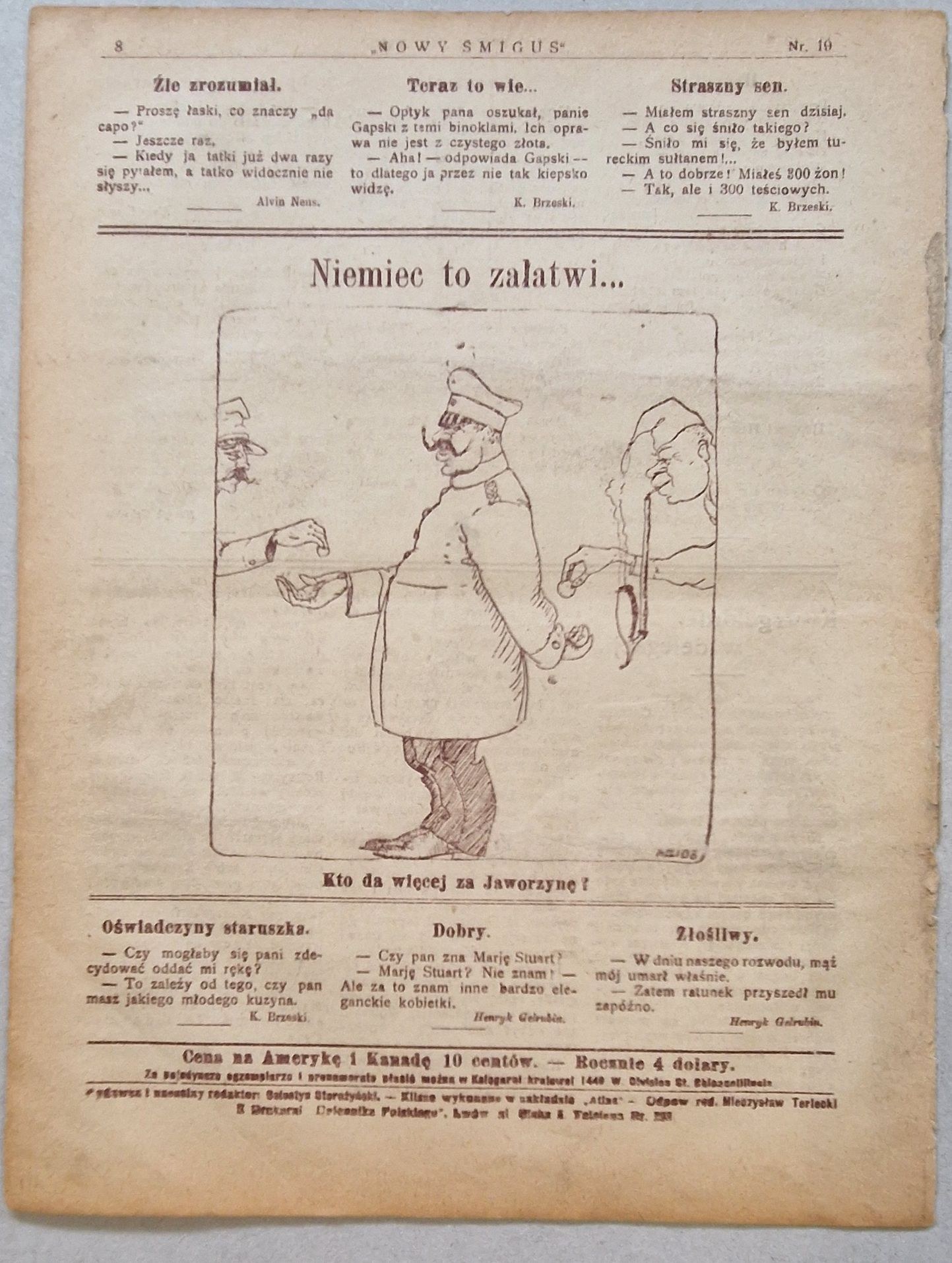 W treści: Mieczysław Terlecki: Przyjazd króla Ferdynanda 1.; na s.8 rysunek zatytułowany „Niemiec to załatwi... Kto da więcej za Jaworzynę?”. Powtórzona ilustracja Wacława Lipińskiego z lewatywą Krokodyla (patrz rok V., nr 6). Lekko antysemicka ilustracja na okładce.