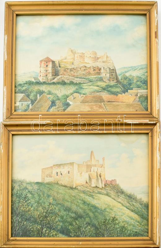 2 db felvidéki vár képe: Vargha Tamás: Fülek, ..., akvarell-papír, jelzett, sérült fakeretben 24x33 cm / 2 watercolor paintings