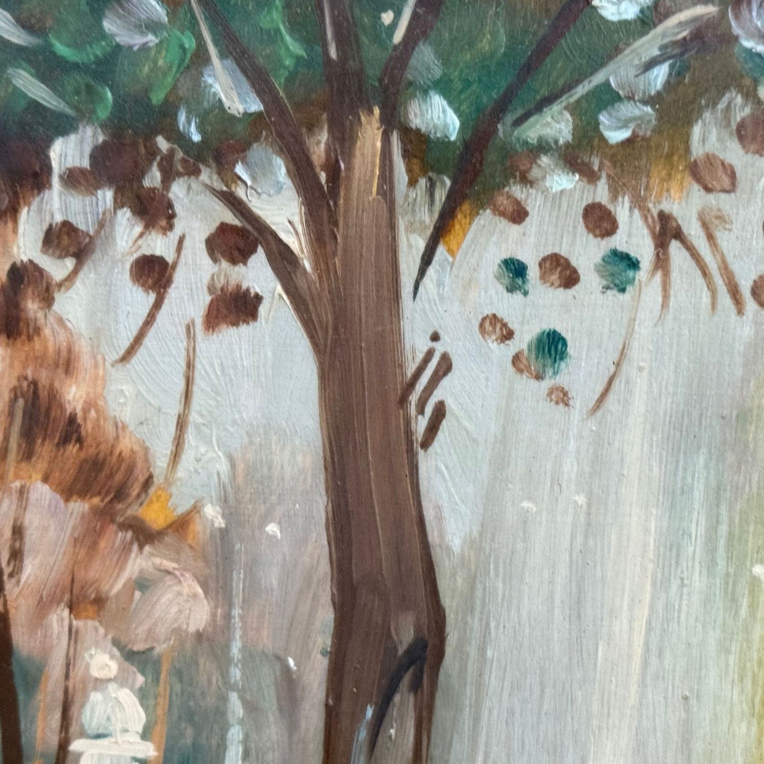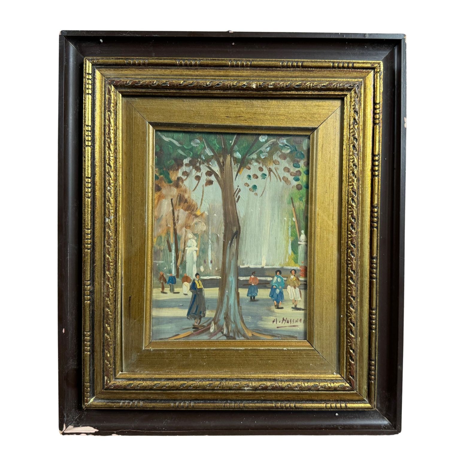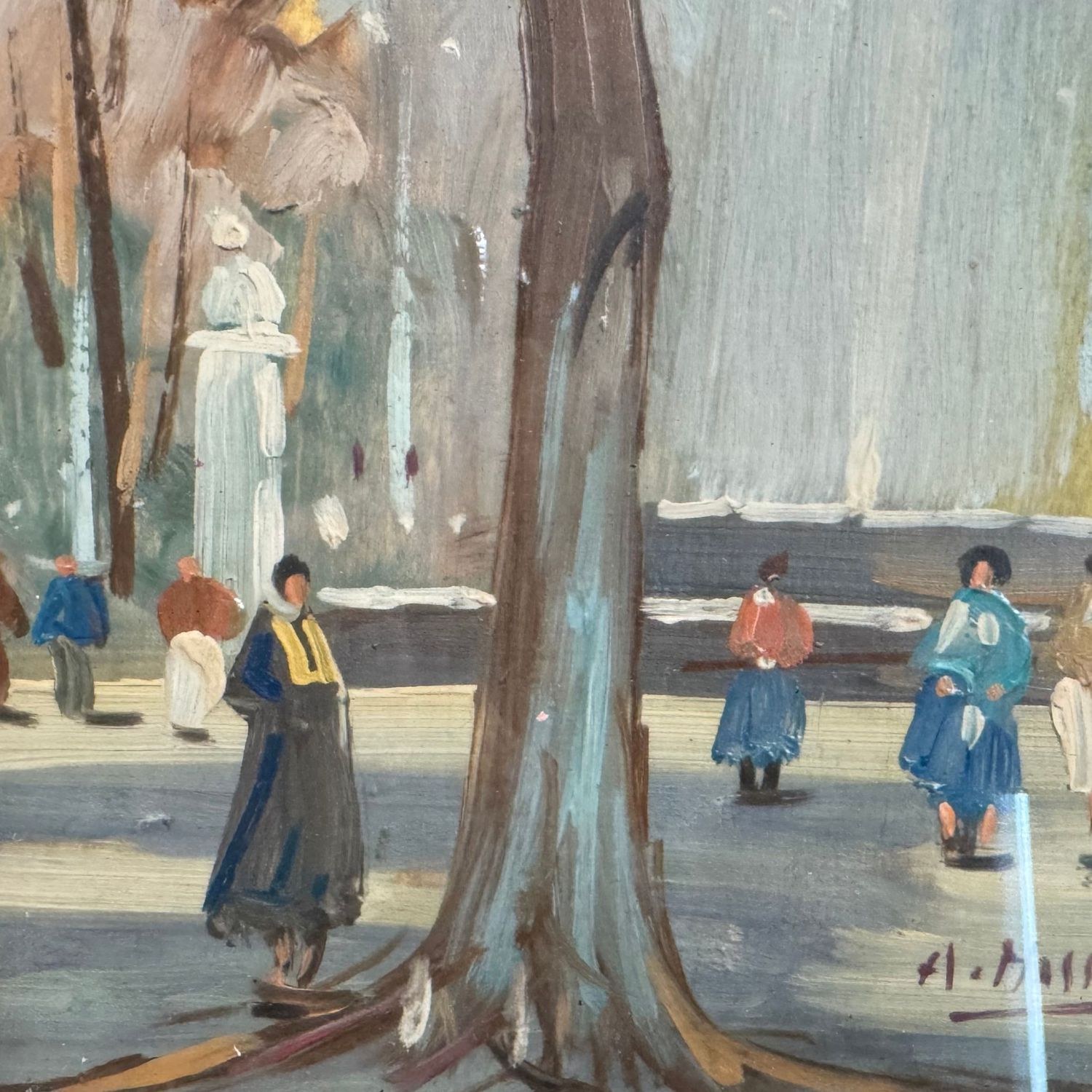 Oil painting on board, 20th century, Italian school, depicting a street scene with figures.