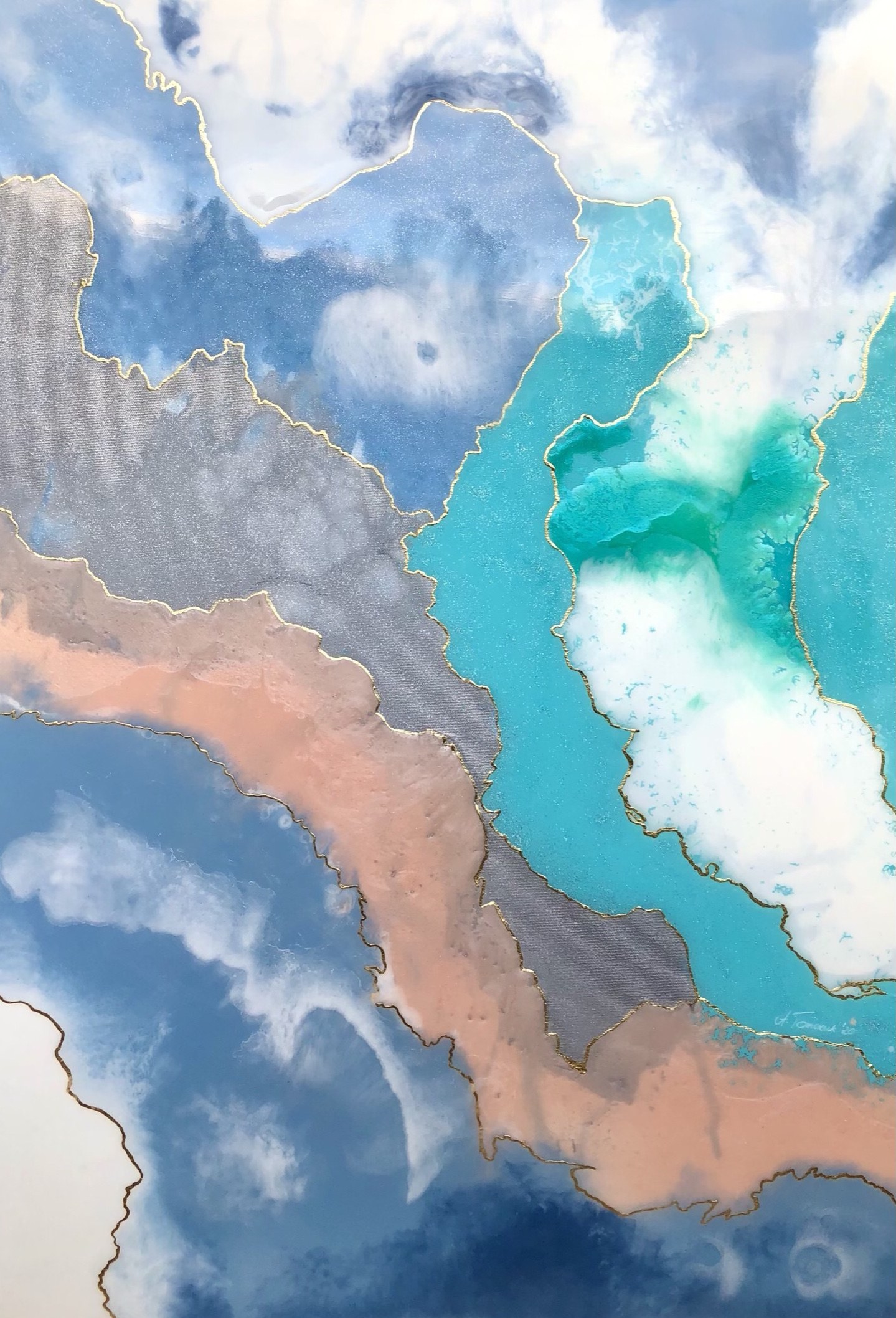 Z tej właśnie przestrzeni wyłonił się ten obraz. Mix farb akrylowych, żywicy jaka stapia się z pigmentami tworząc harmonijne połączenie. Złocenia oddzielają, podkreślają, zaznaczają... świadomie.