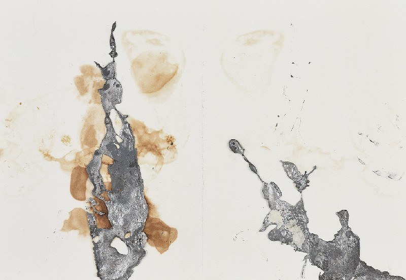 Właściwy obraz to kartka papieru A4, wyraźnie widać zgięcie papieru wpół. Zdawać by się mogło, że artysta wylał plamę cyny na połówkę papieru i odbił ją na drugiej stronie. Jednak jest to odbicie nieregularne, lewa strona jest mniejsza, tylko fragmentaryczna. Ten sam materiał może przybierać różne formy.