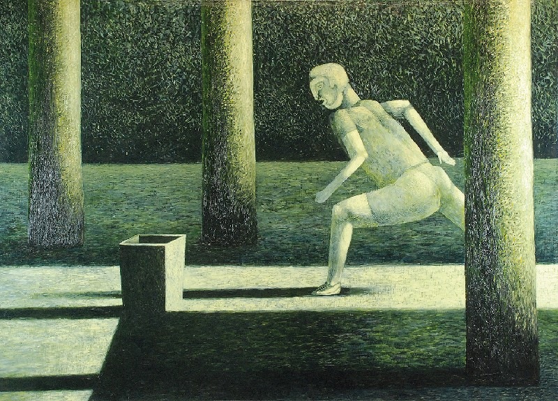 na odwrocie opis autorski: "Podobno biega również nocą" / Andrzej Tobis / olej/pł 130 x 180 / 2000.