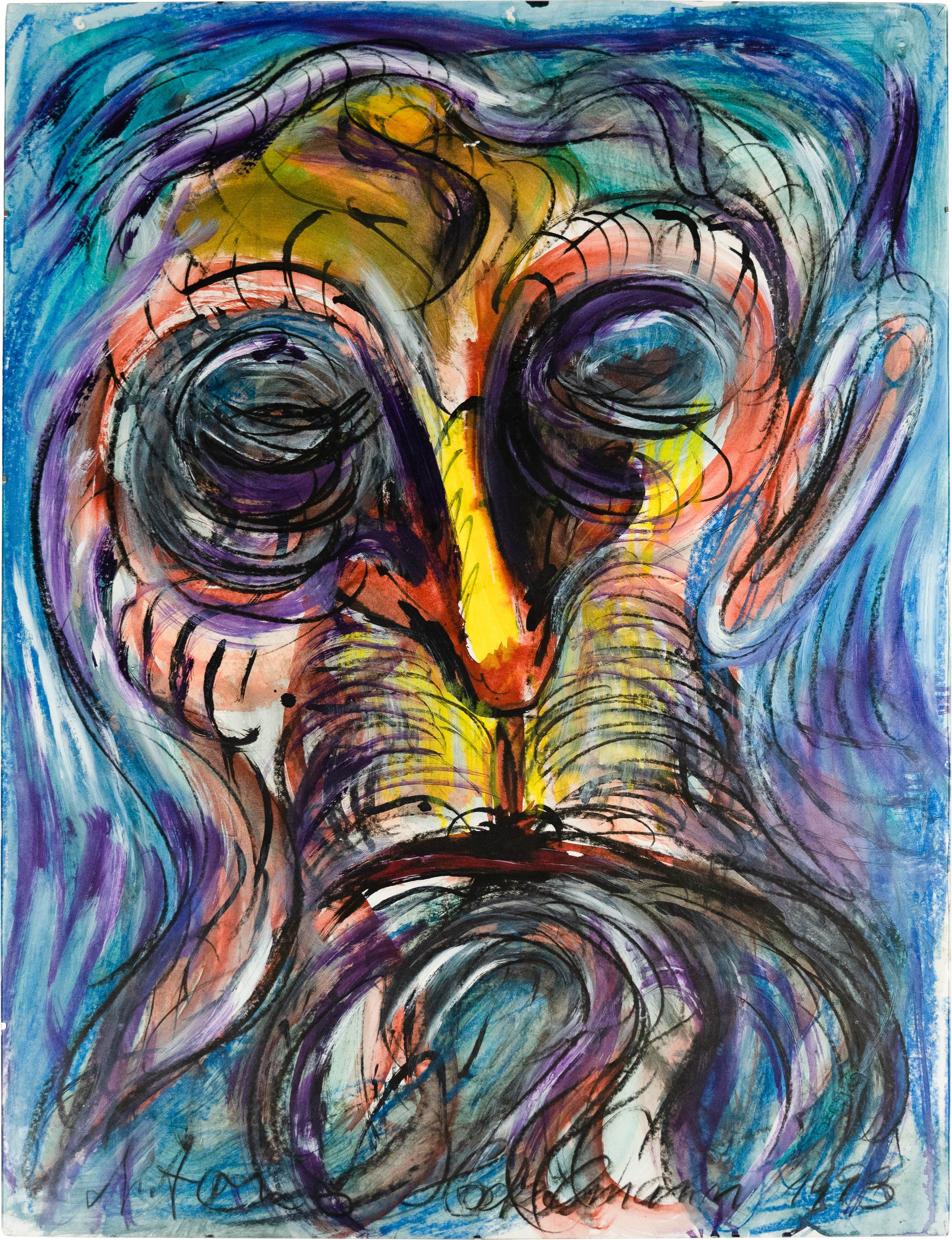 mixed media on paper, 100 cm x 70 cm sheet dimension, signed, dated 1993, pinholes, partial superficial paper tearing, sheet edges partially raised, sheet margins partly slightly torn
