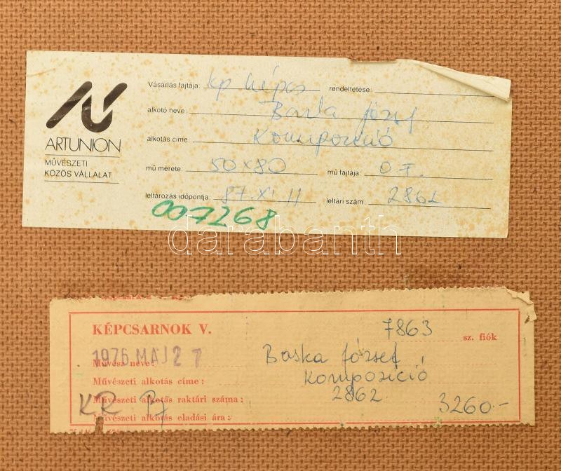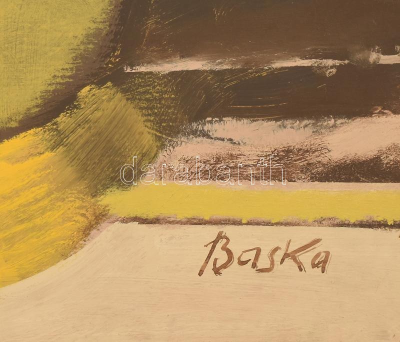 Baska József (1935-2017): Kompozíció. Olaj, farost, jelzett. Hátoldalán Képcsarnok Vállalat címkéivel. Fakeretben...