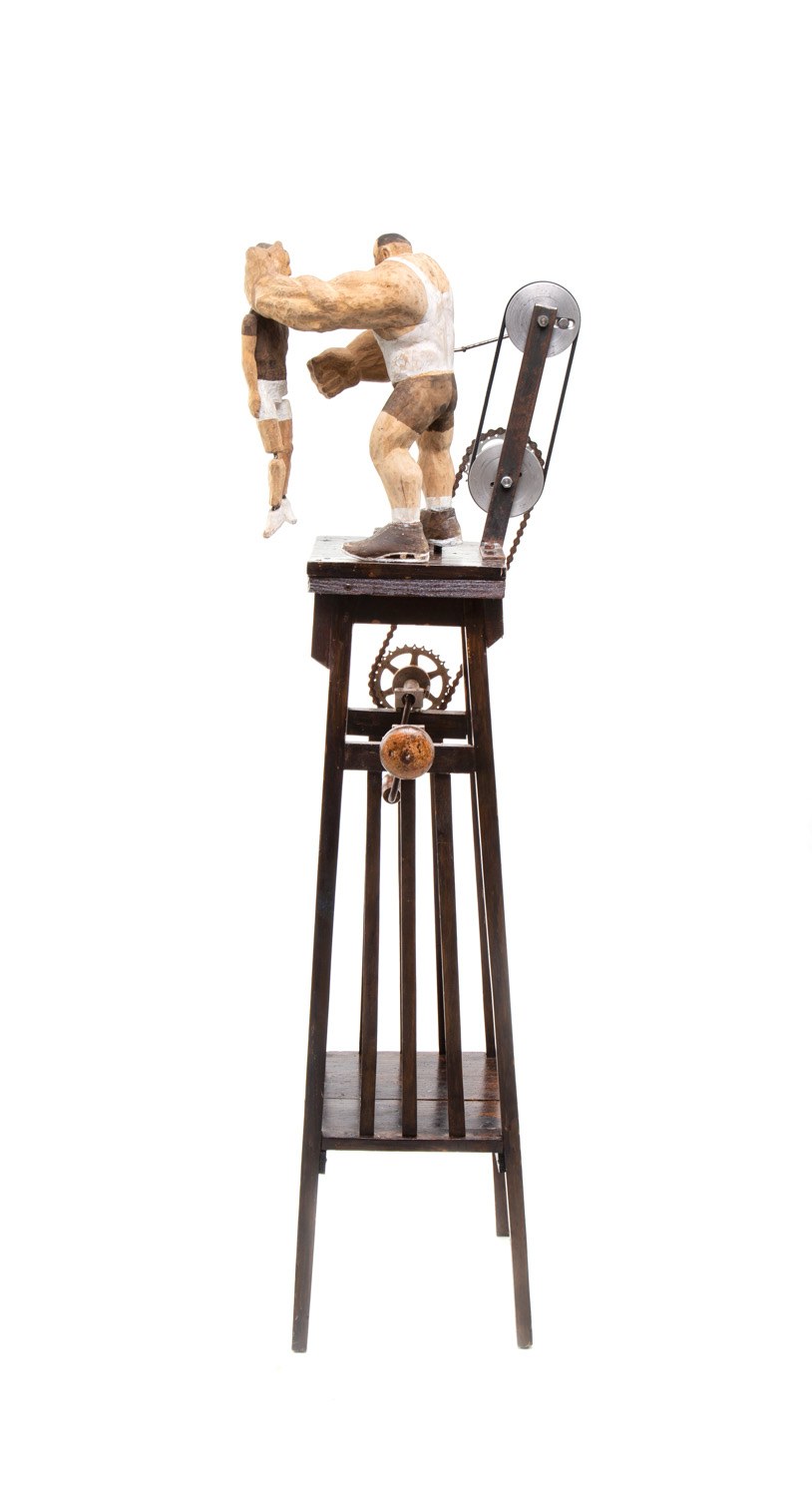 asamblaż/drewno, drewno polichromowane, metal, tworzywo sztuczne