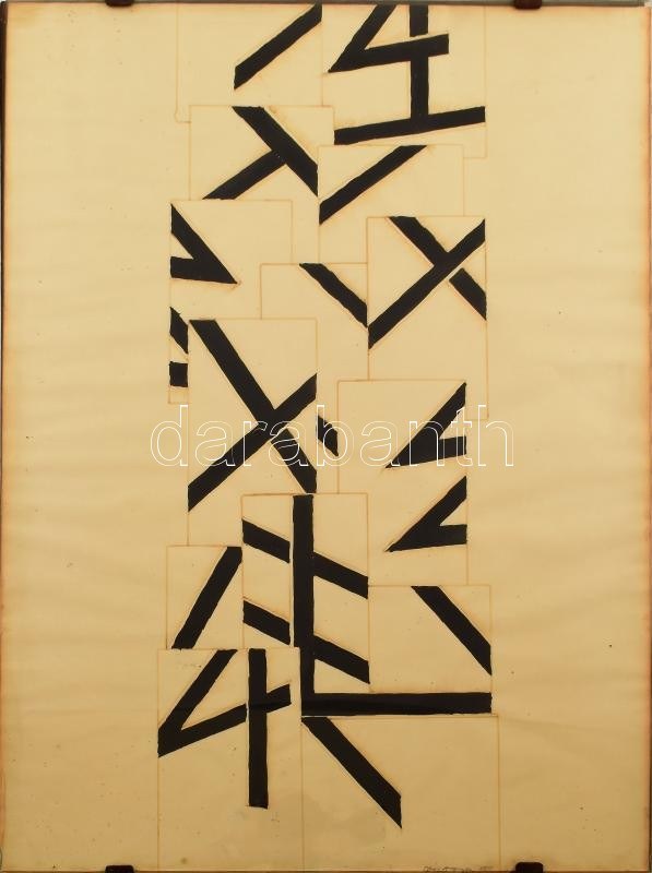Csáji Attila (1939-): Rovásjelek (cím nélkül), 1977. Vegyes technika, papír. Jelezve jobbra lent. Üveg mögött. 66x49 cm / mixed technique on paper, signed lower right