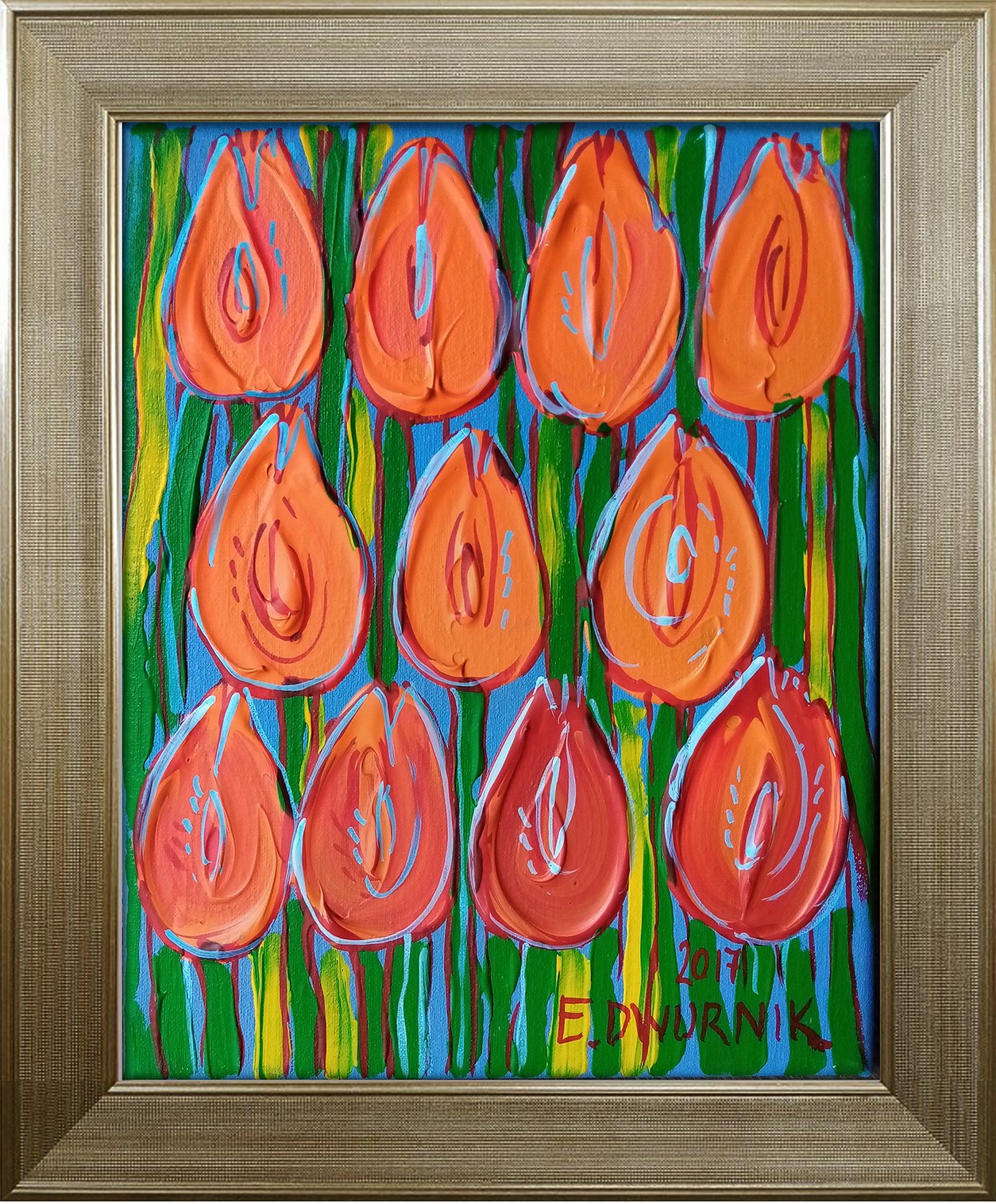 Obraz Edwarda Dwurnika pt. "Pomarańczowe tulipany" zrealizowany został w technice akrylu na podobraziu płóciennym. Praca skatalogowana. Do dzieła dołączony jest autorski certyfikat autentyczności oraz certyfikat autentyczności Galerii Sztuki ART&CULTURE.
