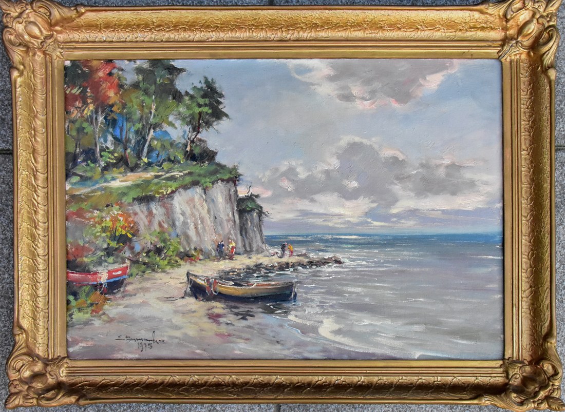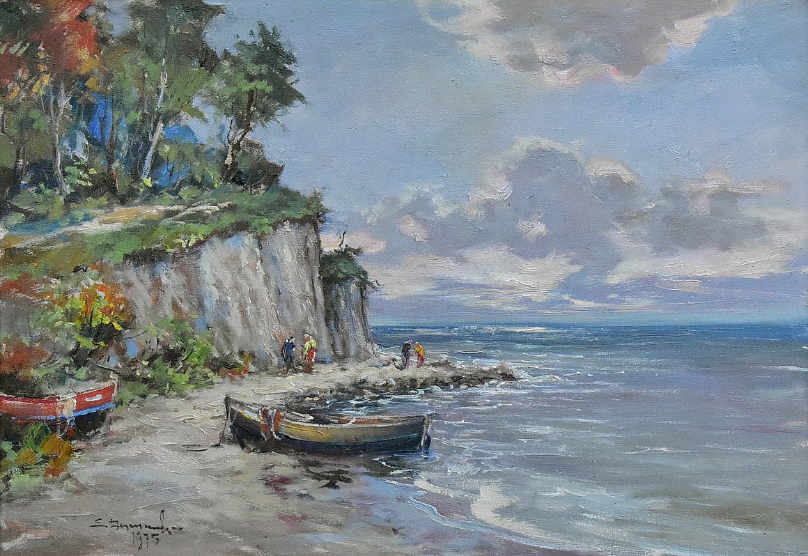 olej, płótno, 48 x 68 cm, sygn. l.d.: E. Dzierzencki / 1975 Na odwrocie autorski opis atramentem: Eugeniusz Dzierzencki / Sopot Abrahama 32 / Urwisty brzeg w Orłowie.
