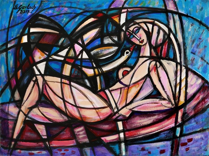sygnowany lgr, sygnowany, opisany na odwrociu:"AUTOR: EUGENIUSZ GERLACH | LEDA Z CZARNYM ŁABĘDZIEM "-2017 | OLEJ-PŁÓTNO-64X83cm | Egerlach