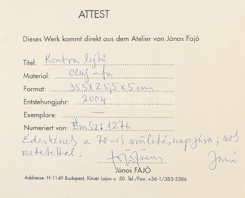 Fajó János (1937-2018): Kontra lejtő, 2004. Olaj, fa, jelzett a hátoldalán, attest és Fajó János autográf ajándékozási soraival Haraszty István (1934-2022) szobrász, festőművész 70. születésnapjára a hátoldalán. 35,5x25,5x5 cm. / Jan (János) Fajó (1937-2018): Kontra lejtő, 2004. Oil on wood, signed, with attest and autograph dedication lines on the reverse for István Haraszty. 35,5x25,5x5 cm.