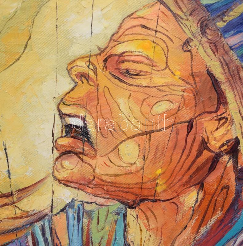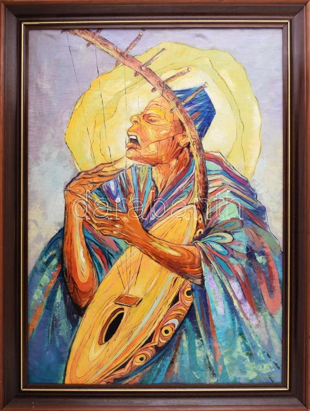 Frederick Omoyama Odorige (1967-), nigériai festő: Tatafo (zenélő sámán). Olaj, vászon, jelezve jobbra lent. Kiállítva: Egyéni kiállítás. Magyarországi Szociáldemokrata Párt, Dohány u., Bp., 1998. Reprodukálva a kiállítás prospektusában. Fakeretben. 86x60 cm. KIZÁRÓLAG SZEMÉLYES ÁTVÉTEL, NEM POSTÁZZUK / ONLY PERSONAL COLLECTION IN OUR OFFICE!