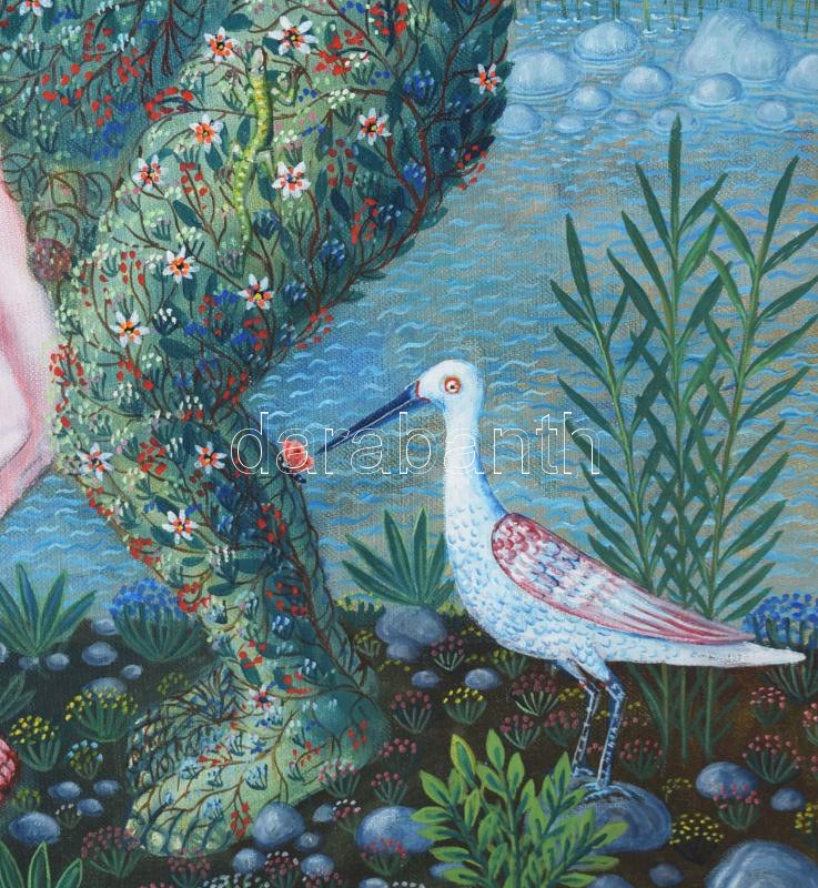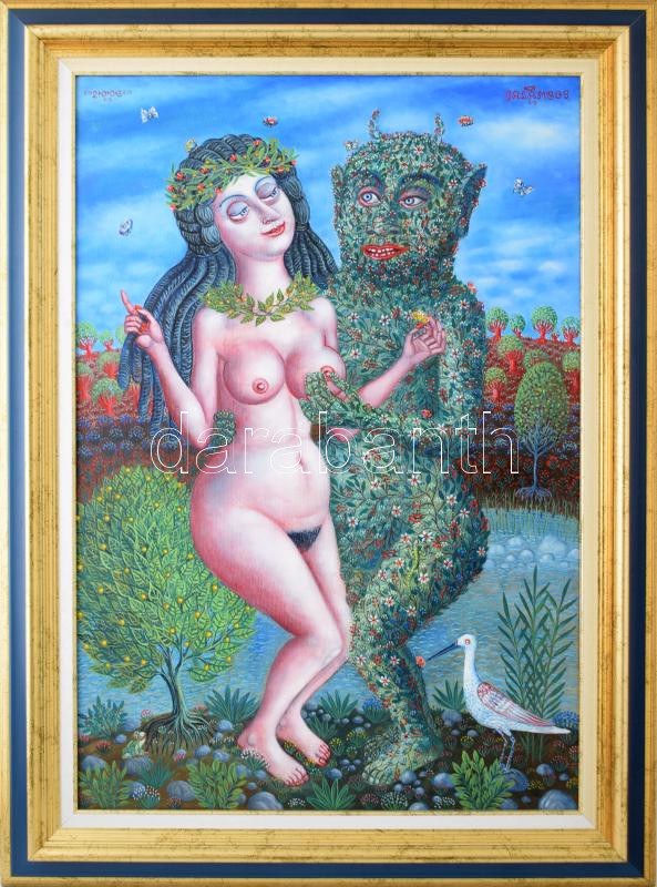 Galambos Tamás (1939 - ): Szépség és a Faun. Olaj, vászon, jelzett, keretben 80x56 cm