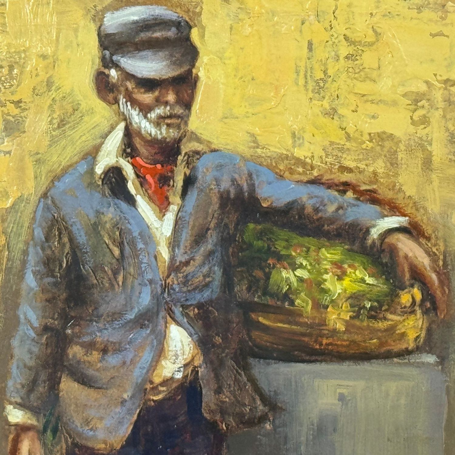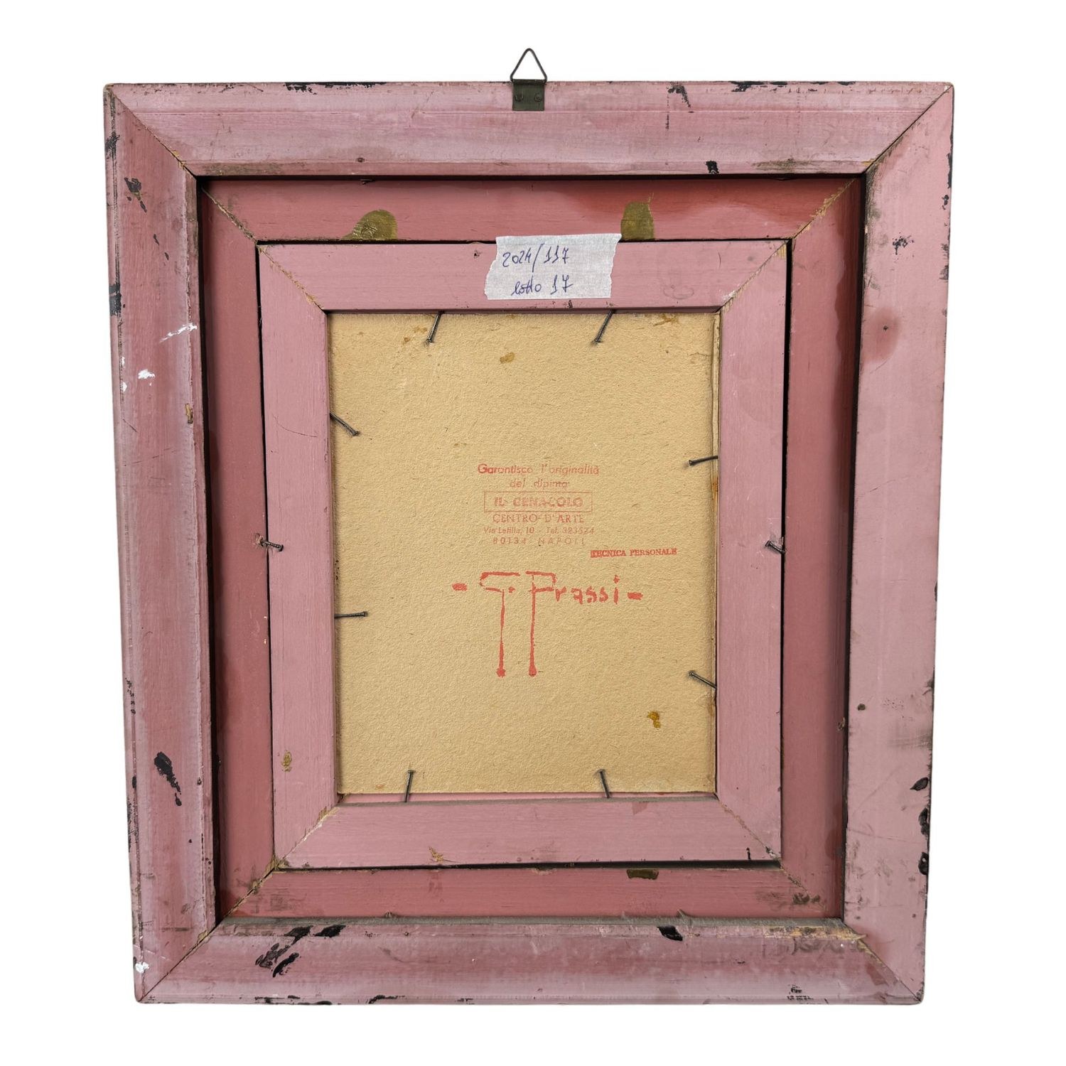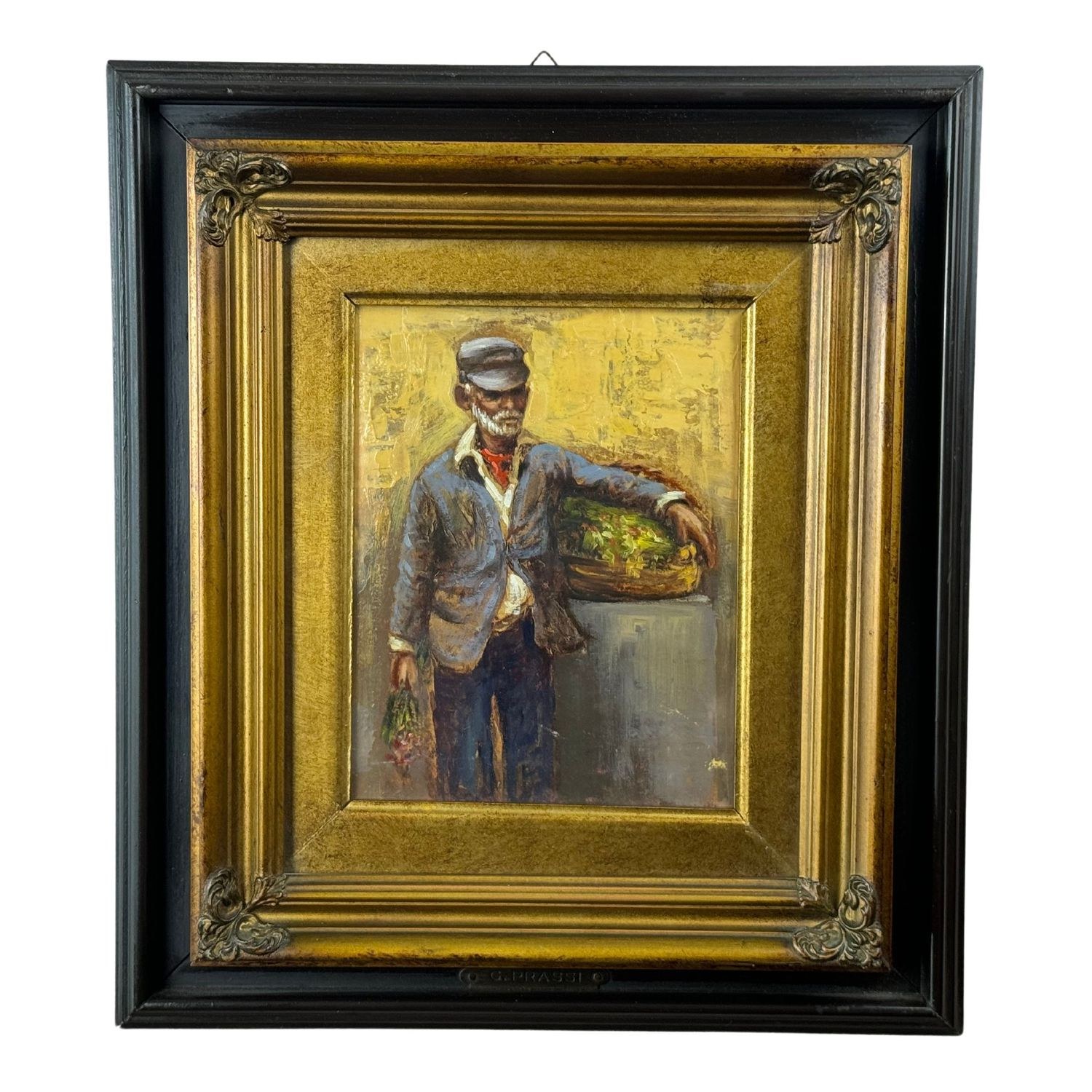 Oil painting on cardboard, 20th-century Italian school, depicting The flower seller. Frame dimensions: 16x20 cm. Dimensions including frame: 33x37 cm. Signed and authenticated on the back by Giovanni Prassi 1945. The artwork is in good condition.
