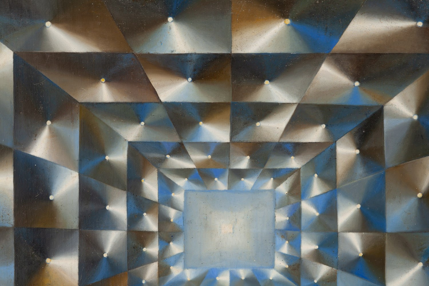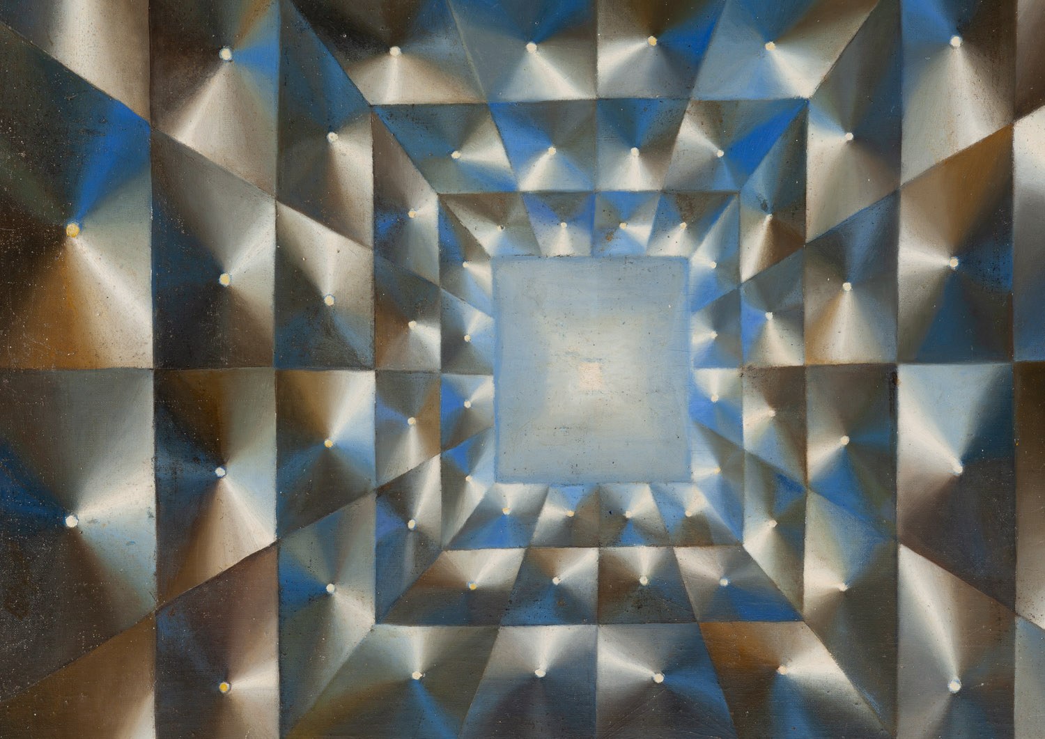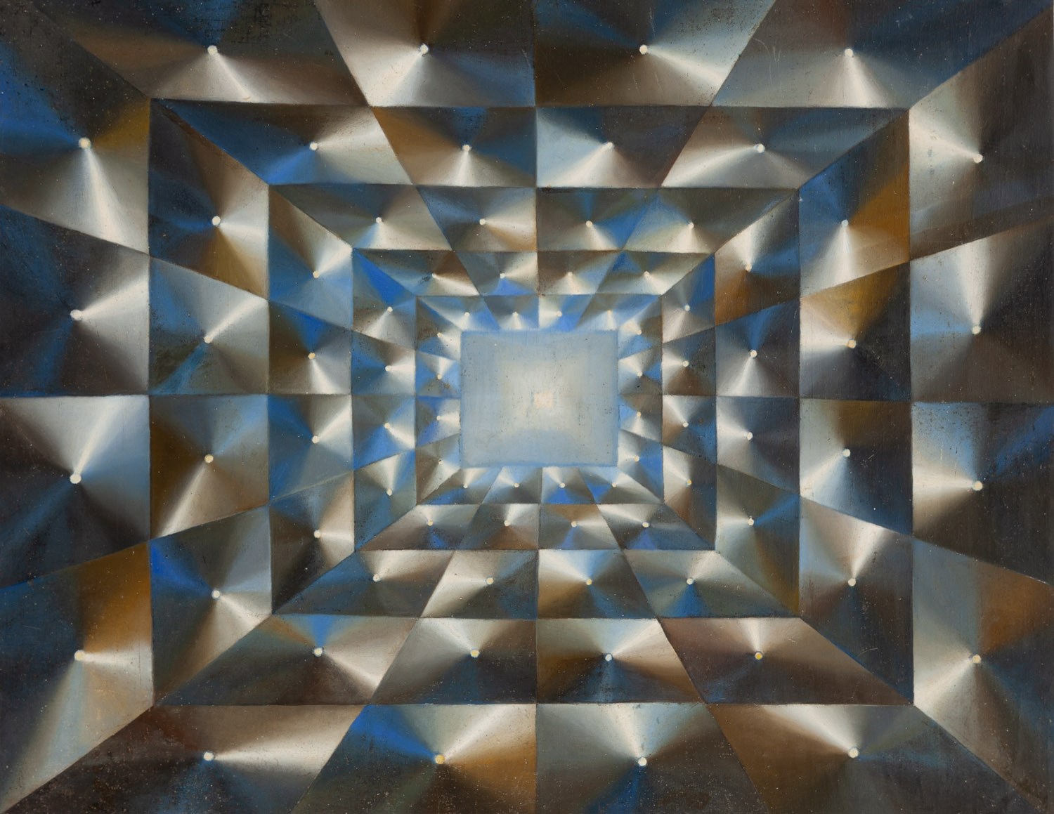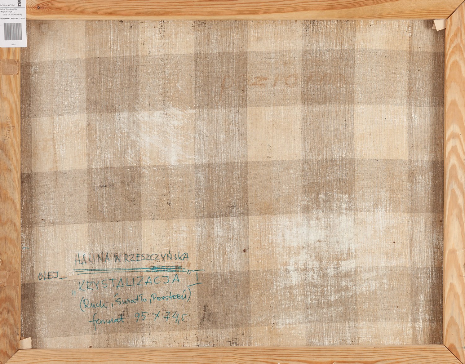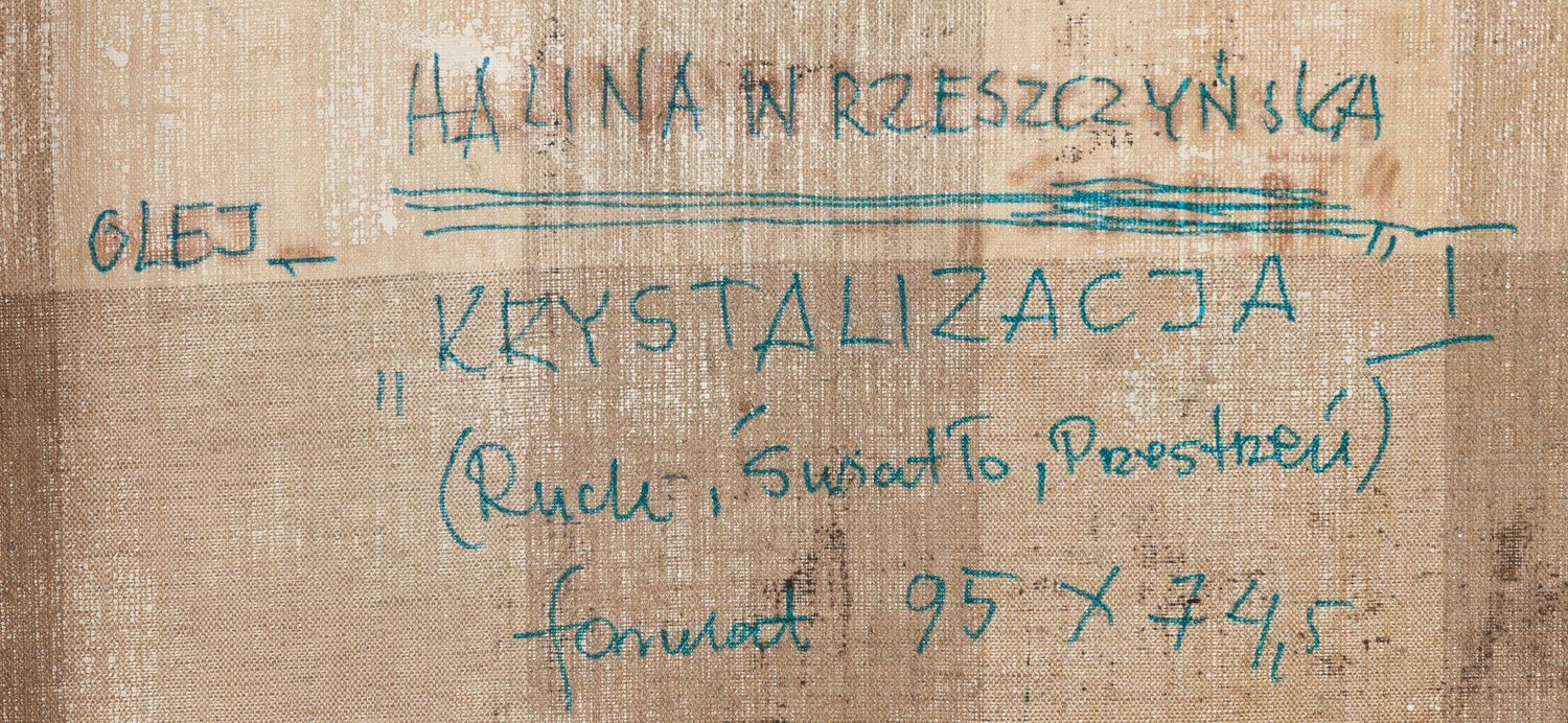 sygnowany, datowany i opisany na odwrociu: 'HALINA WRZESZCZYŃSKA | "KRYSTALIZACJA" I | (Ruch, Światło, Przestrzeń) | format 95 x 74,5'