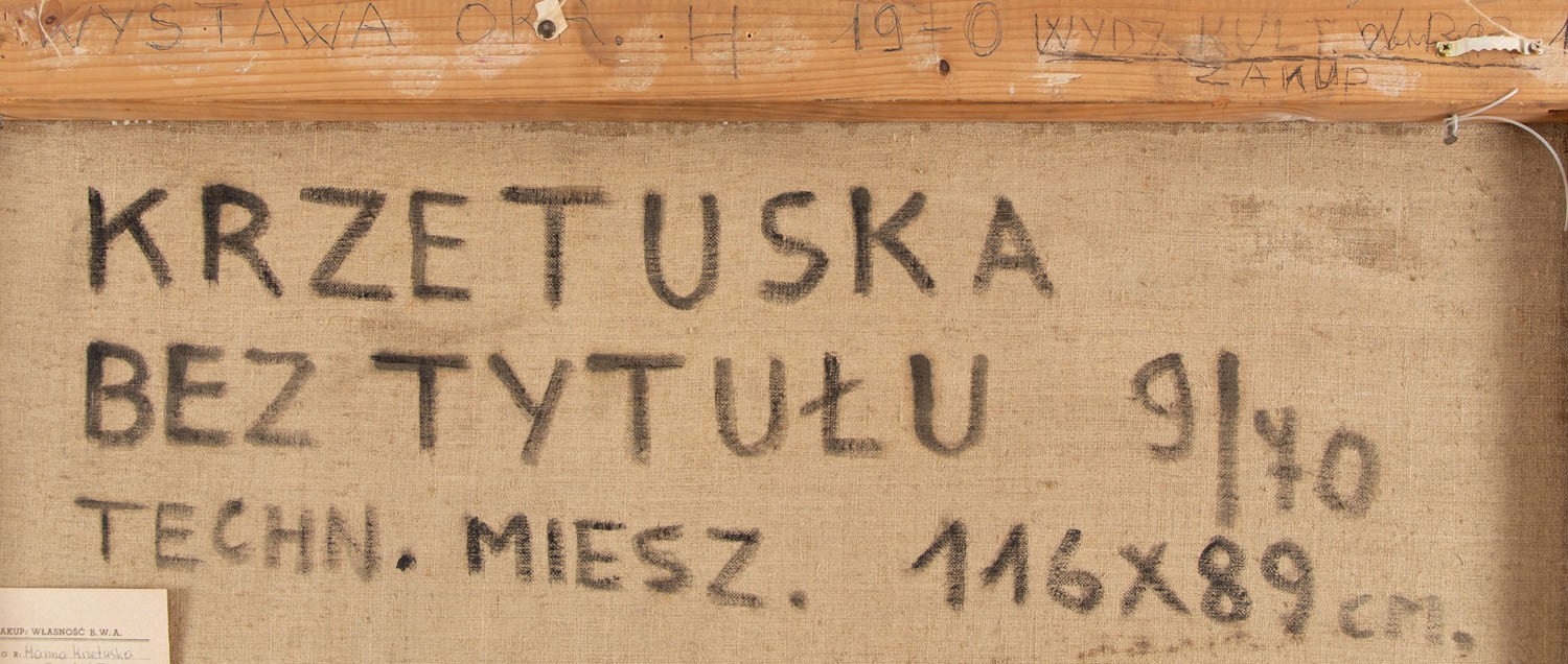 sygnowany, datowany i opisany na odwrociu: 'KRZETUSKA | BEZ TYTUŁU 9/70 | TECHN. MIESZ. 116 x 89 cm.'