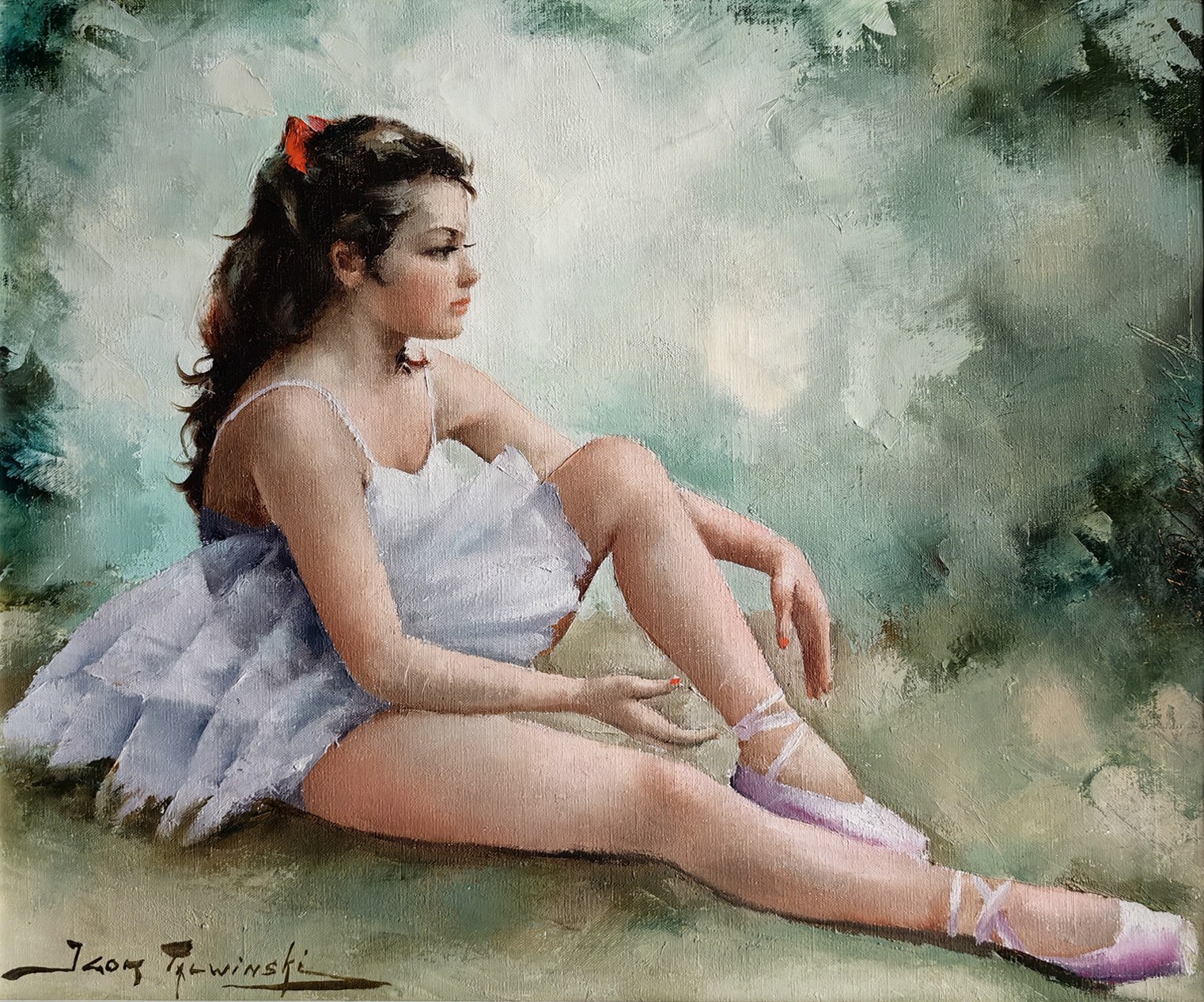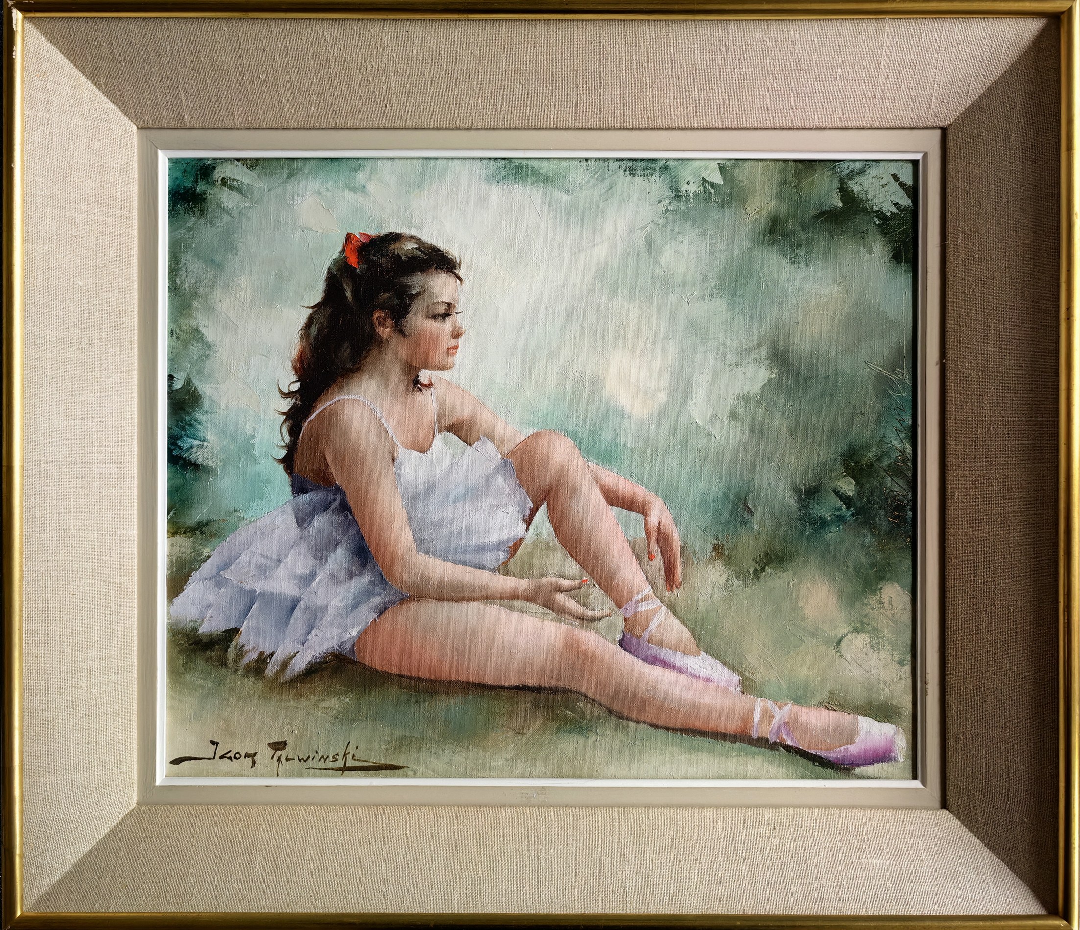 Liryczny wizerunek siedzącej baletnicy, ukazanej w momencie odprężenia po występie lub przed próbą. Artysta z wyczuciem formy i światła oddaje subtelność kobiecego ciała, podkreślając wdzięk postaci i ulotność chwili. Malarskość tła oraz miękkie, niemal pudrowe światło typowe są dla stylu Talwińskiego, bliskiego francuskiemu akademizmowi i estetyce XVIII-wiecznej. Praca wysokiej klasy kolekcjonerskiej.