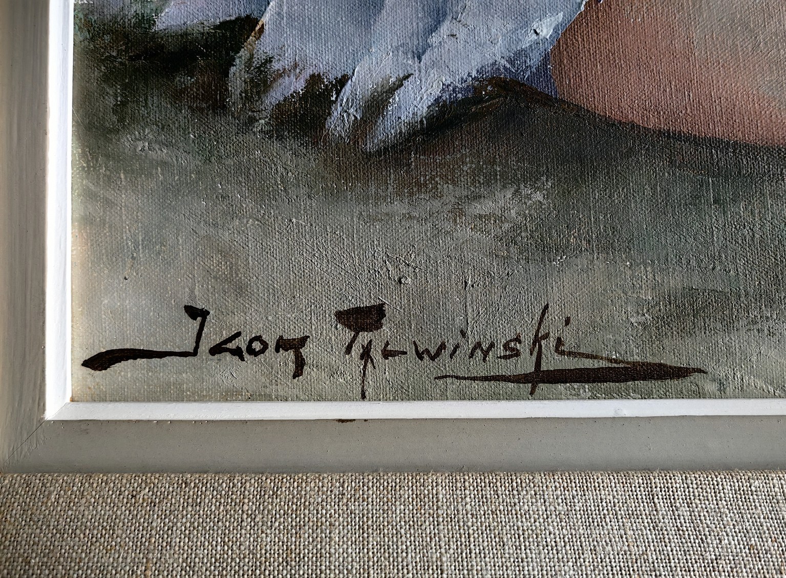 Olej na płótnie, oprawa oryginalna, rama drewniana z tkaniną i złoceniem