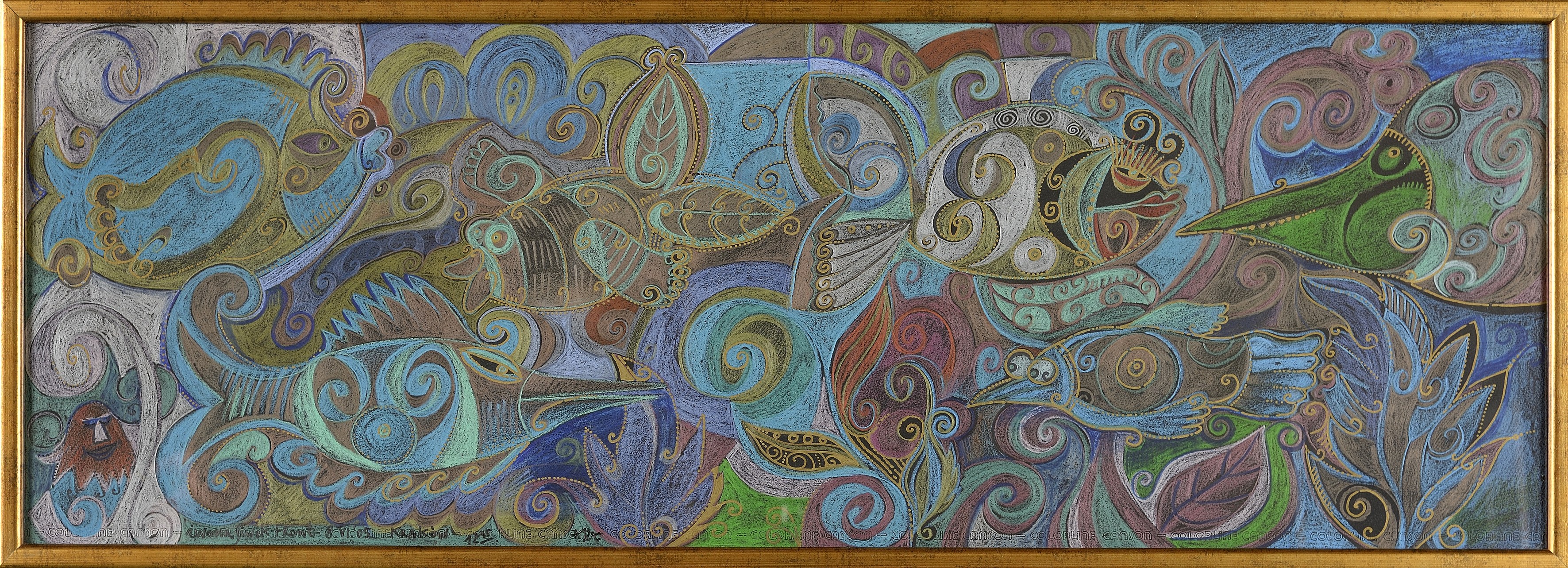 Technika mieszana: pastel, kredka, marker na papierze, 37 x 102 cm,