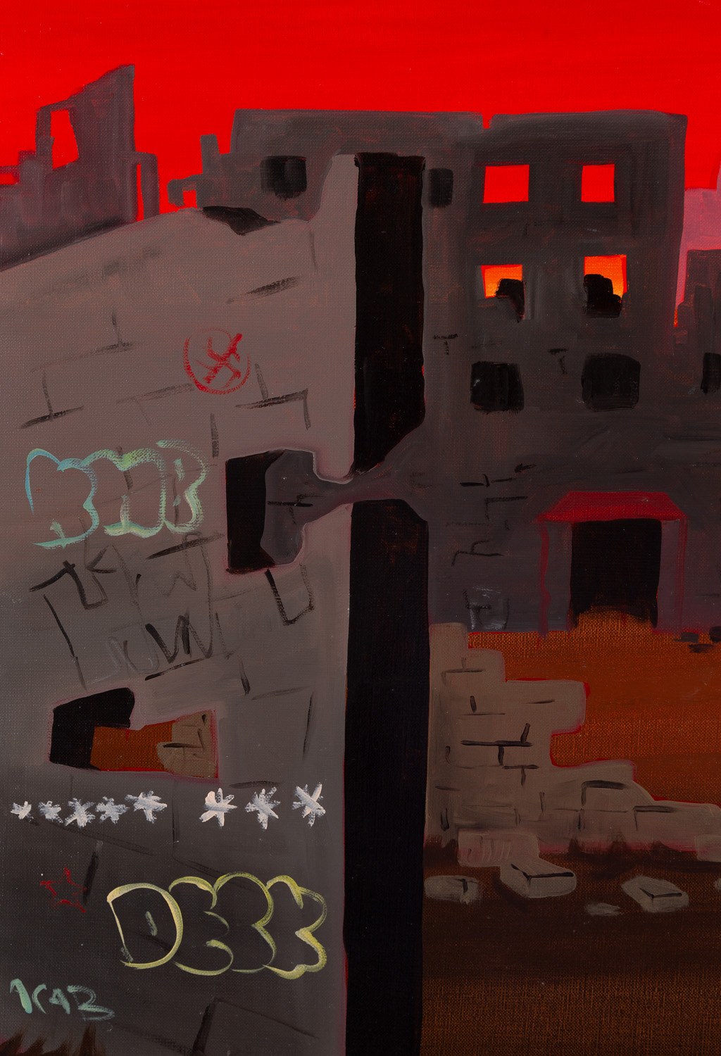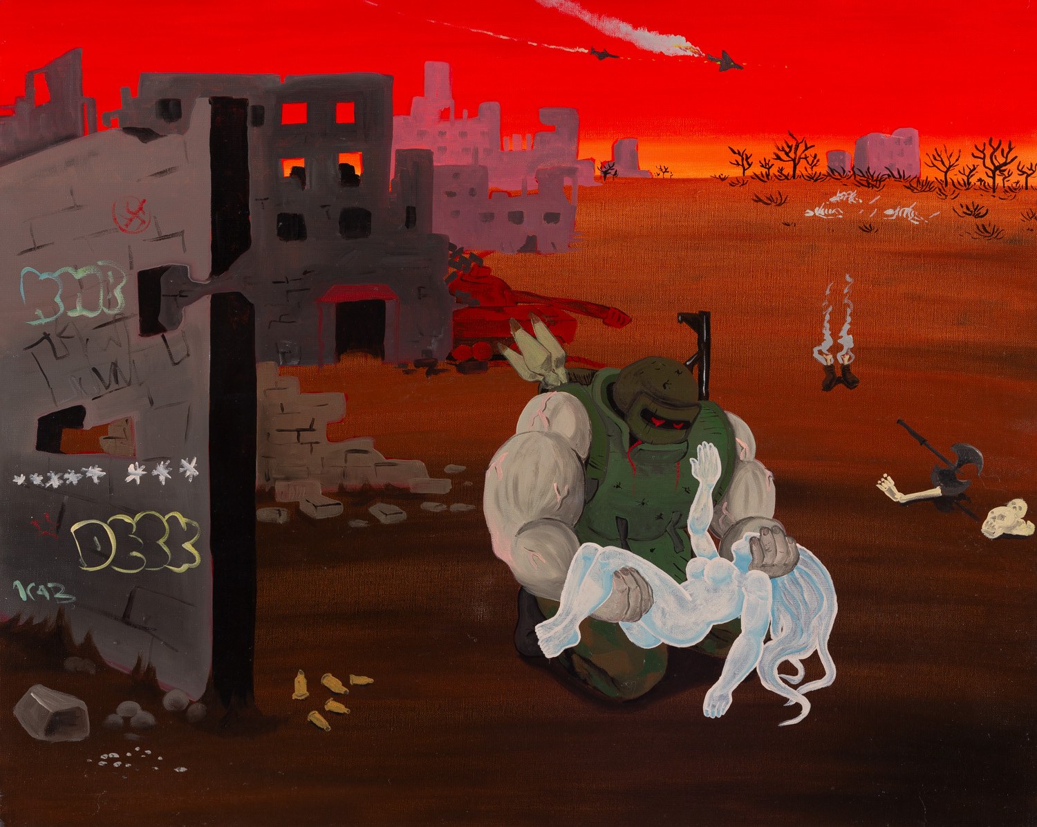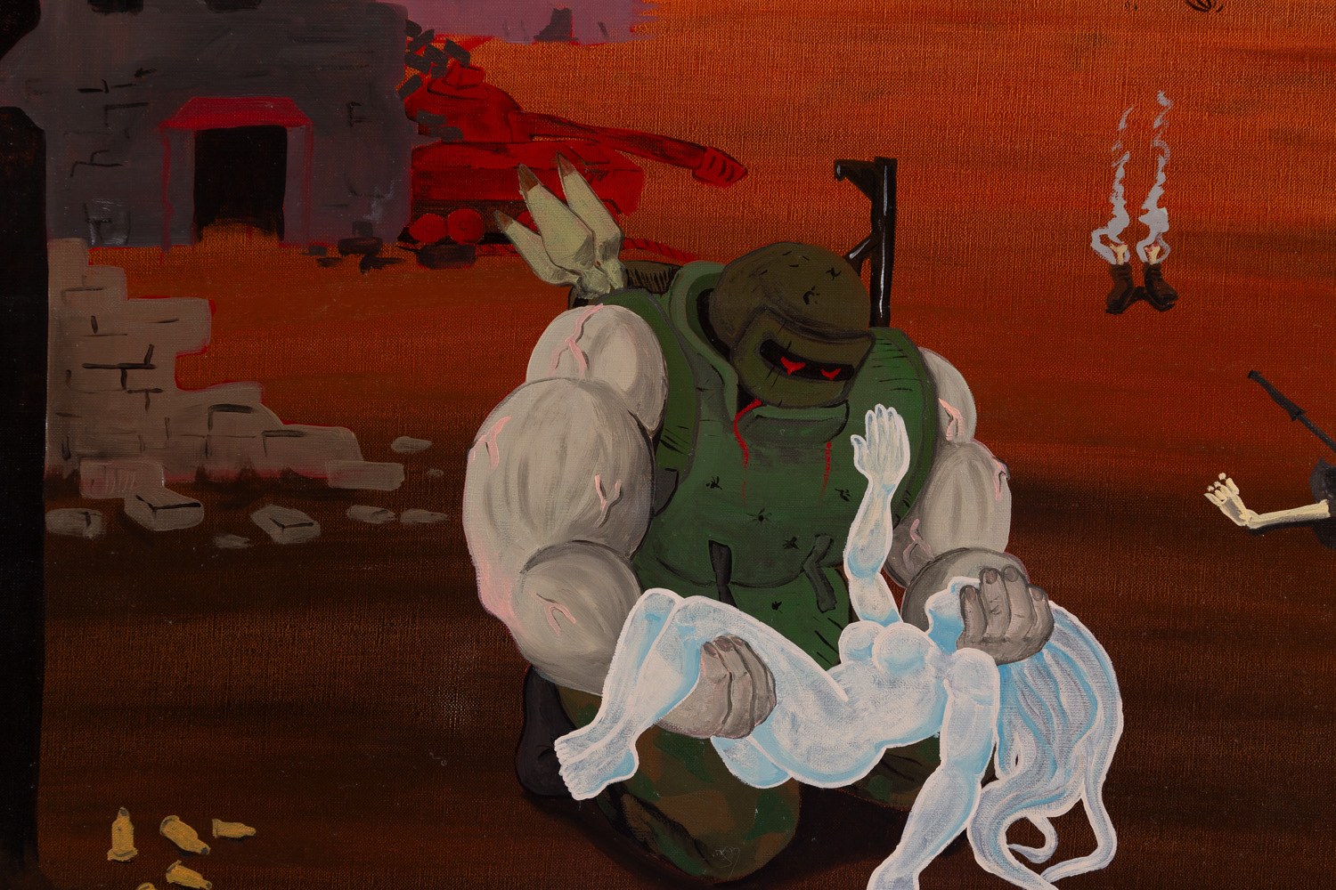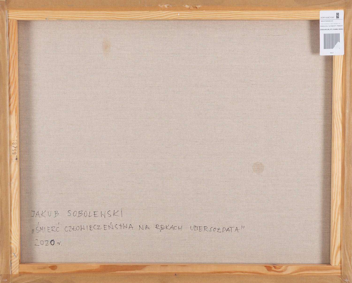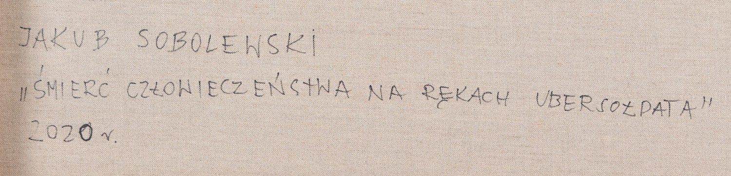 sygnowany, datowany i opisany na odwrociu: 'JAKUB SOBOLEWSKI | "ŚMIERĆ CZŁOWIECZEŃSTWA NA RĘKACH UBERSOŁDATA" | 2020 r.'