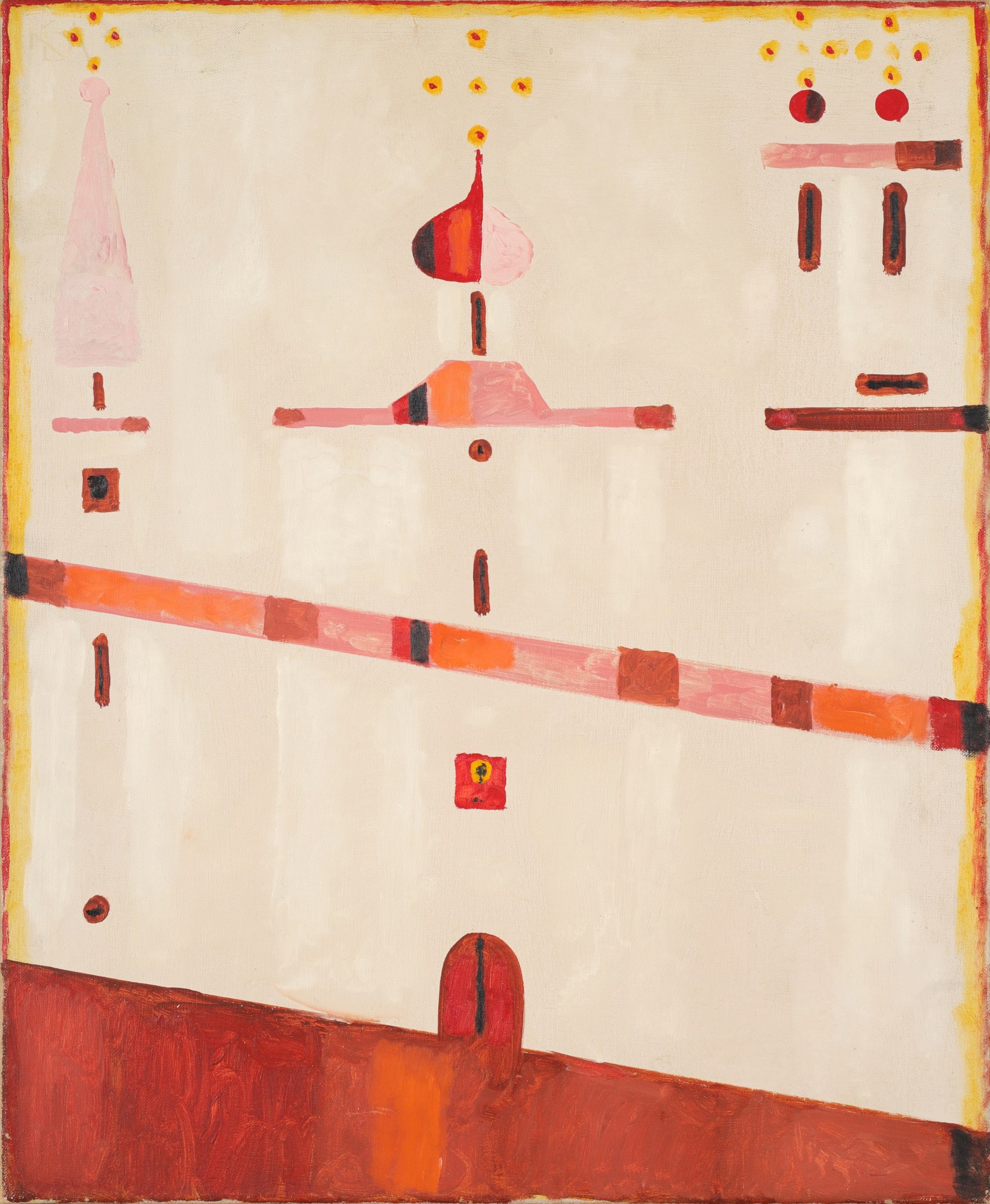 Wspomniany obraz to wysmakowana kolorystycznie kompozycja, która, pomimo silnej stylizacji, czytelnie przedstawia architekturę cerkwi. Wyrysowane linie diagonalne oraz geometryczne, walorowane w odcieniach czerwieni i oranżu elementy wprowadzają do obrazu znamienny dla sztuki Jerzego Nowosielskiego pulsacyjny rytm, stanowiący prawdziwą ucztę dla oka. Rytm ten i rodzaj obecnej w malarstwie artysty poświaty (uwidaczniającej się również w żółto-czerwonej bordiurze) nadaje przedstawieniu wymiar metafizyczny – odbiorca dzieła czuje, że ma do czynienia ze świątynią, monumentalną budowlą, która kryje w sobie światło.