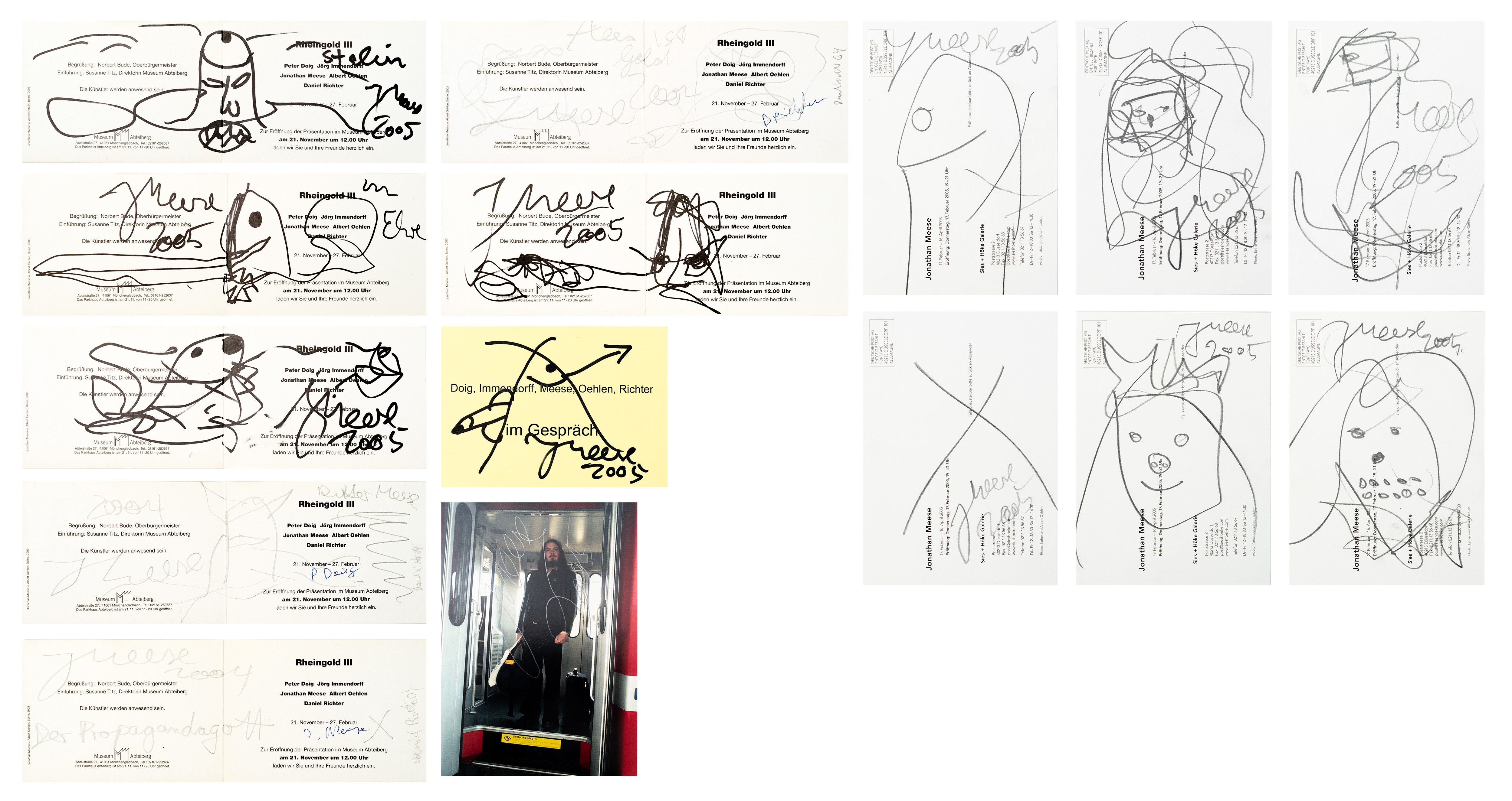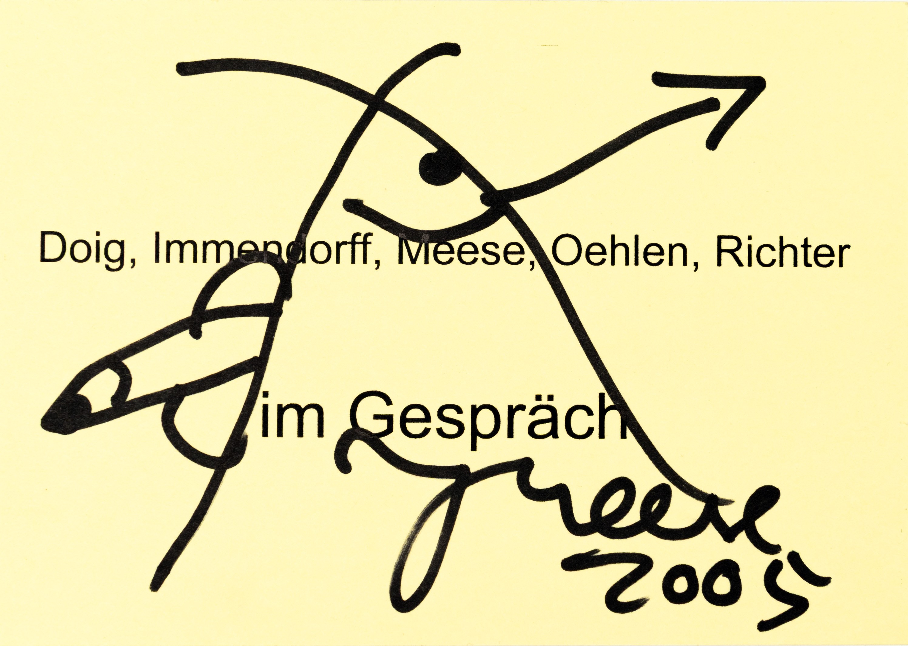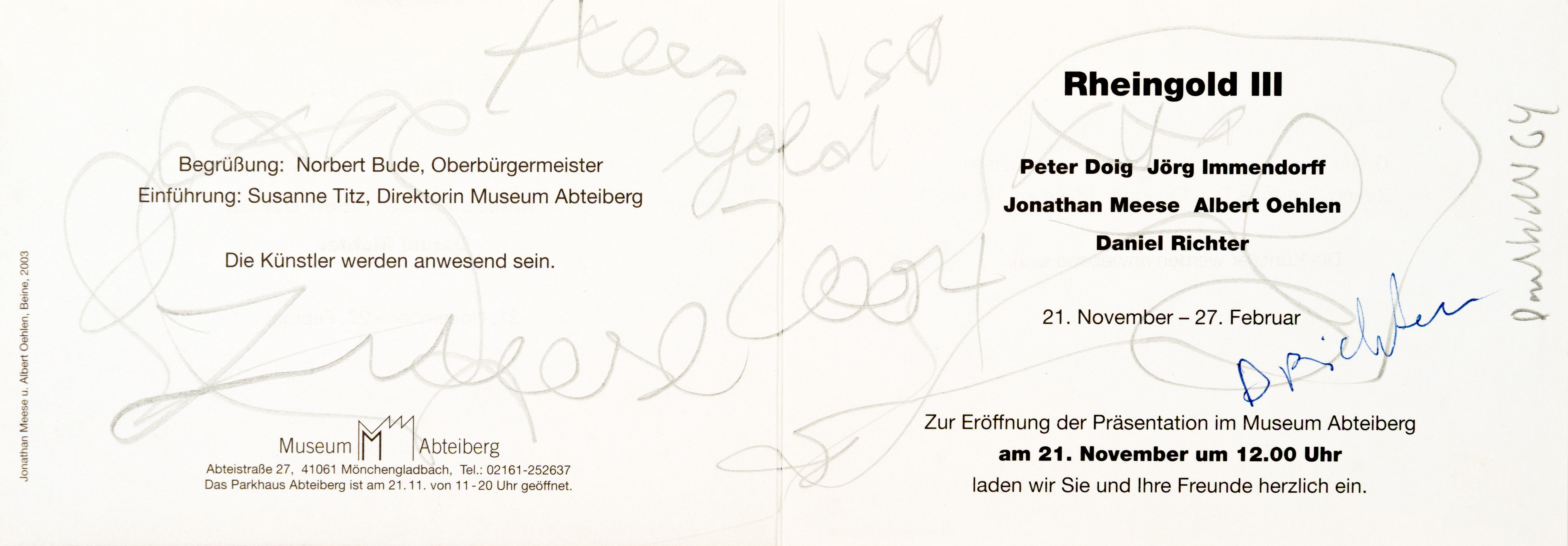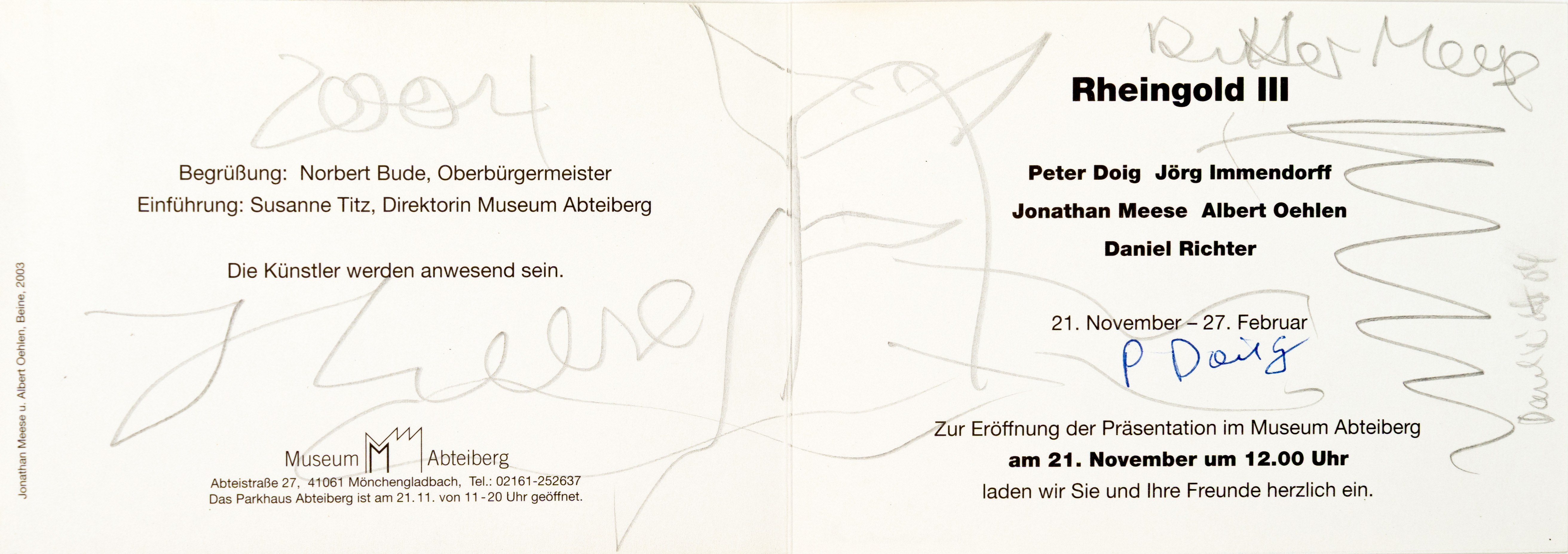 15-pcs, bundle of exhibition invitations and flyers with sketches and artist's signature, 10 times pencil on firm paper, 5 times Edding on firm and light paper, 7 times 10.5 cm x 30 cm sheet dimensions, 7 times 17.5 cm x 12.7 cm sheet dimensions and 1 time 10.5 cm x 15 cm sheet dimensions, each signed, signed once by Peter Doig, signed twice by Daniel Richter, partially minimally rubbed
