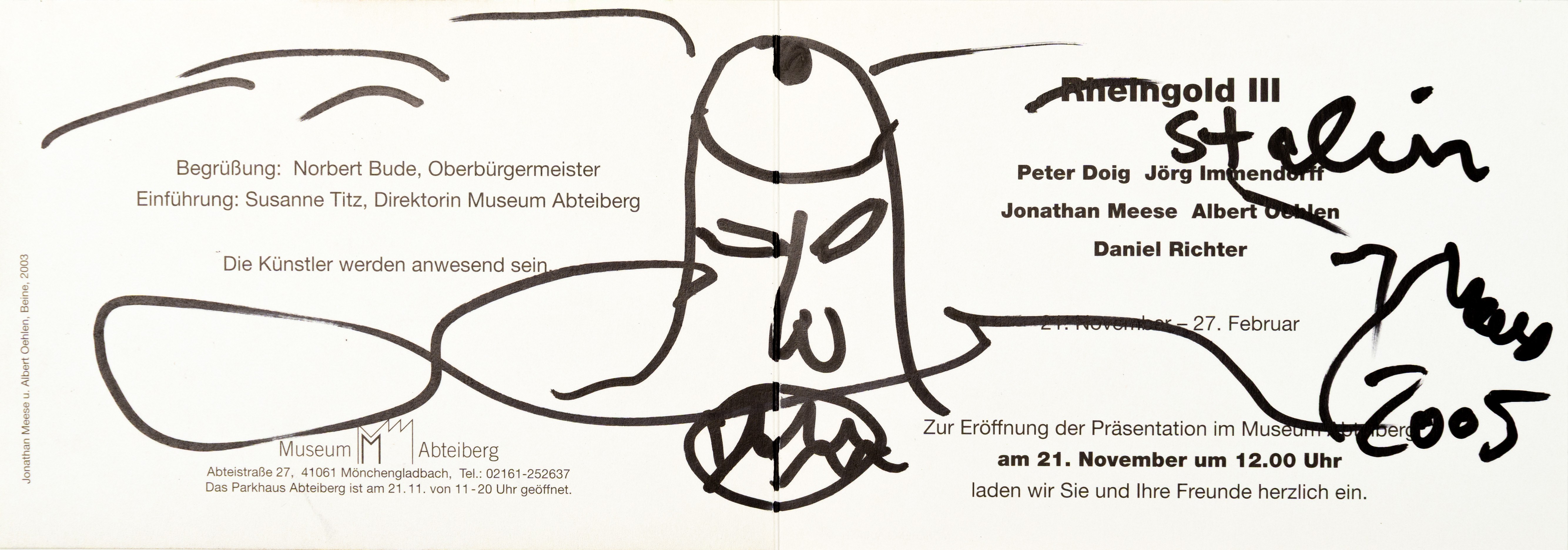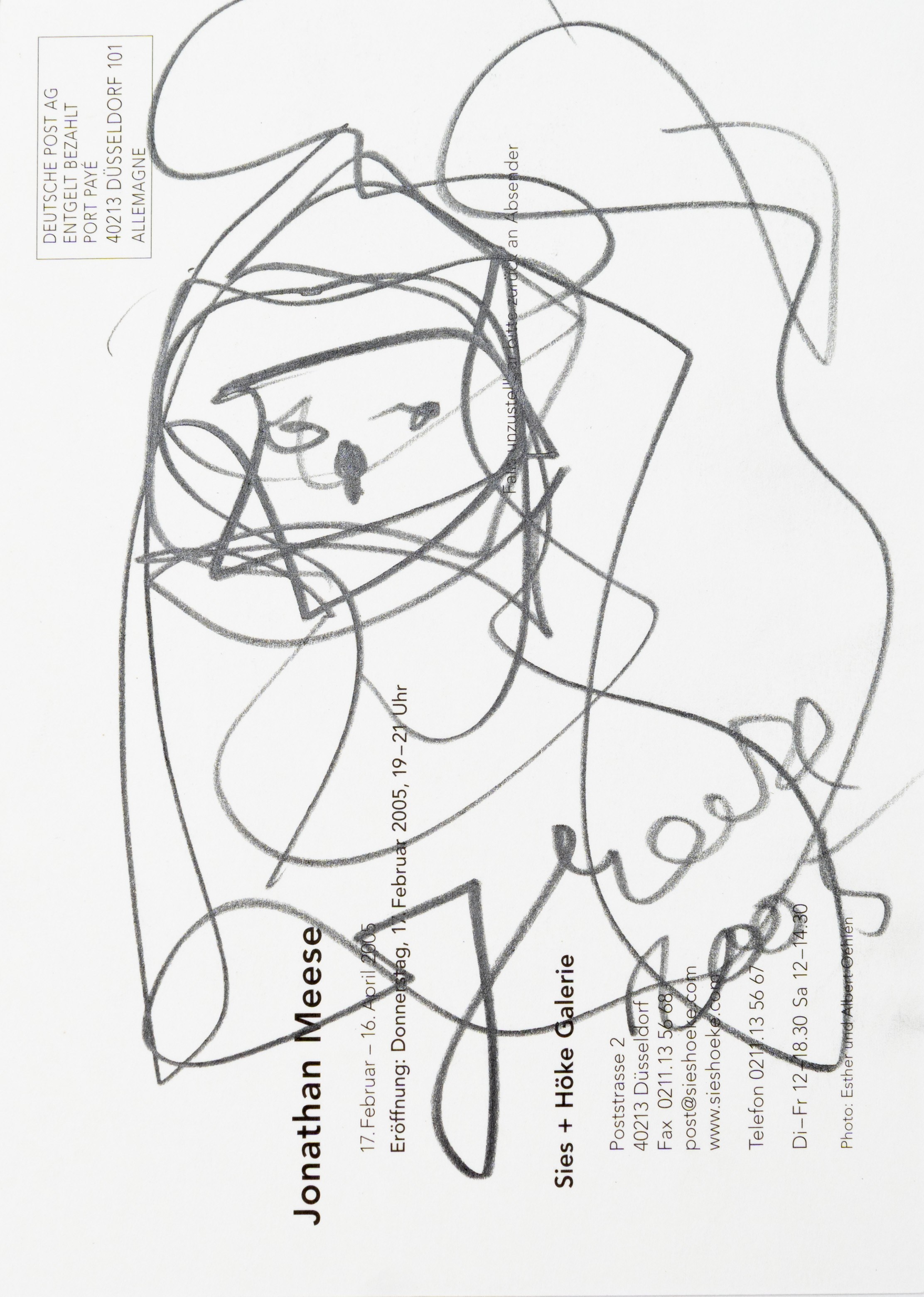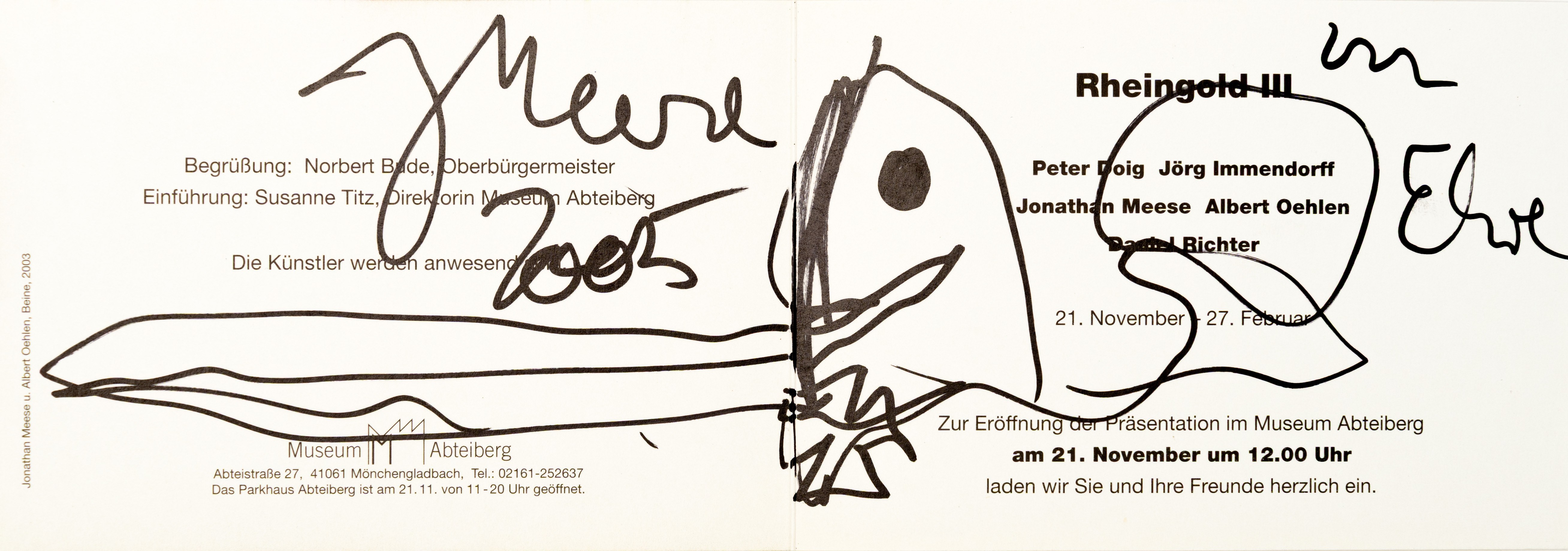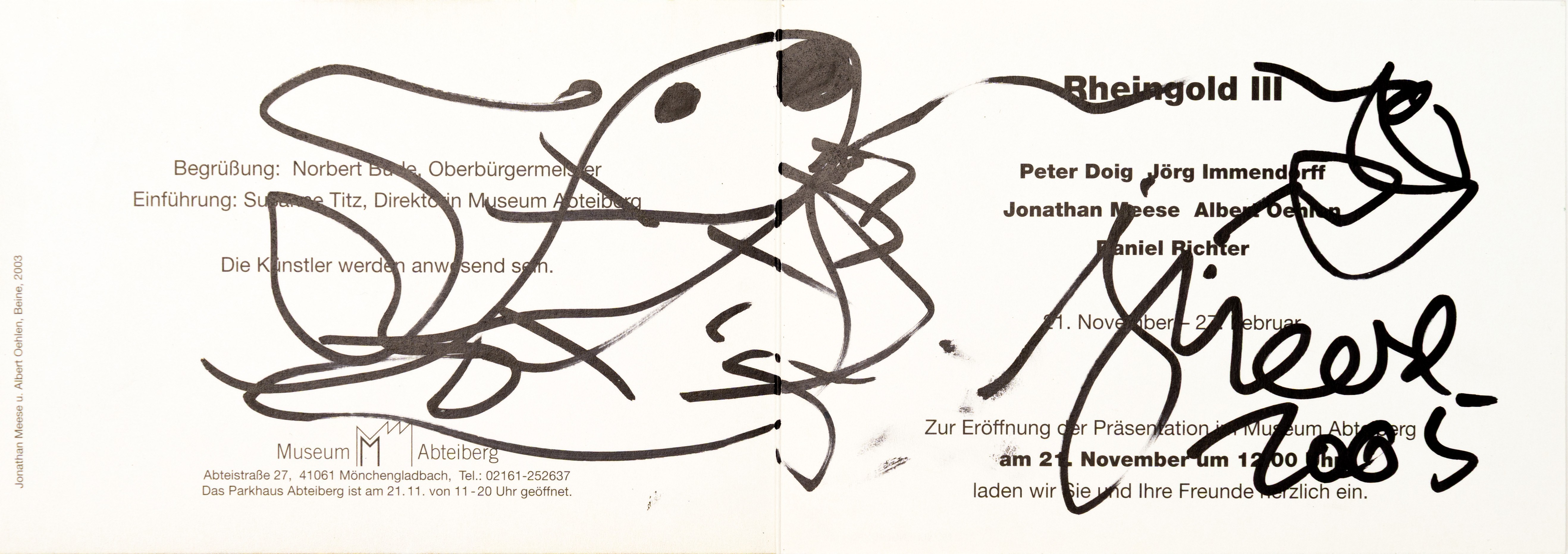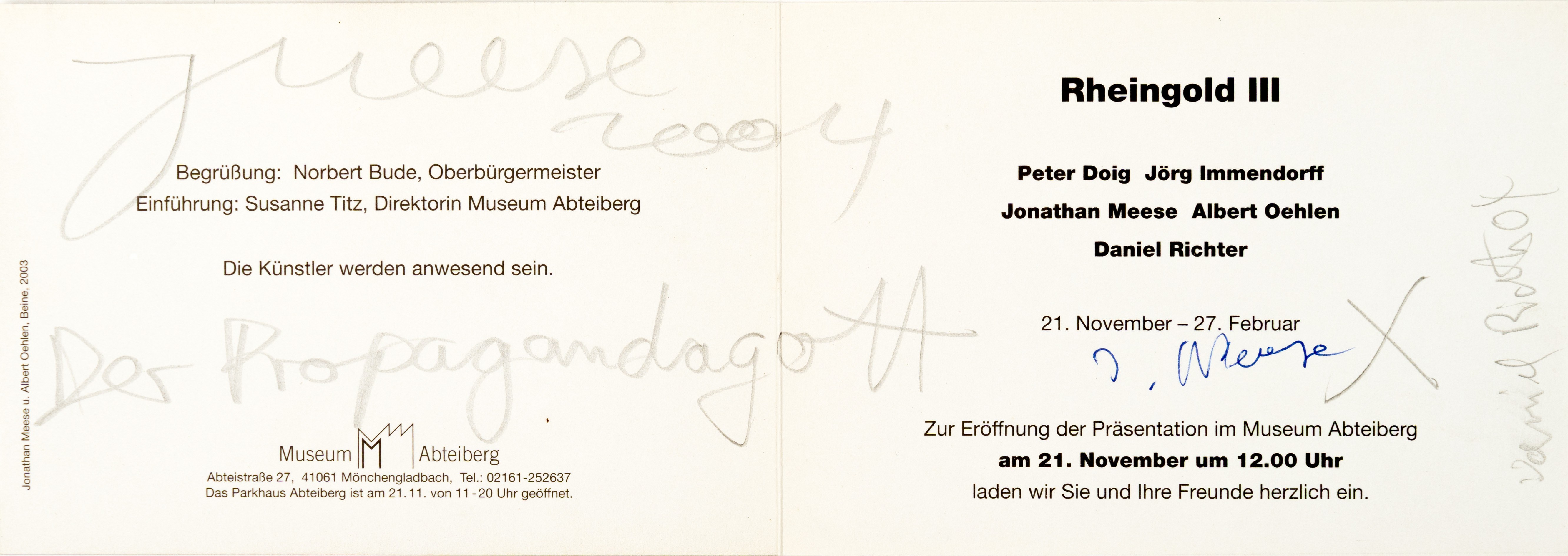 15-pcs, bundle of exhibition invitations and flyers with sketches and artist's signature, 10 times pencil on firm paper, 5 times Edding on firm and light paper, 7 times 10.5 cm x 30 cm sheet dimensions, 7 times 17.5 cm x 12.7 cm sheet dimensions and 1 time 10.5 cm x 15 cm sheet dimensions, each signed, signed once by Peter Doig, signed twice by Daniel Richter, partially minimally rubbed