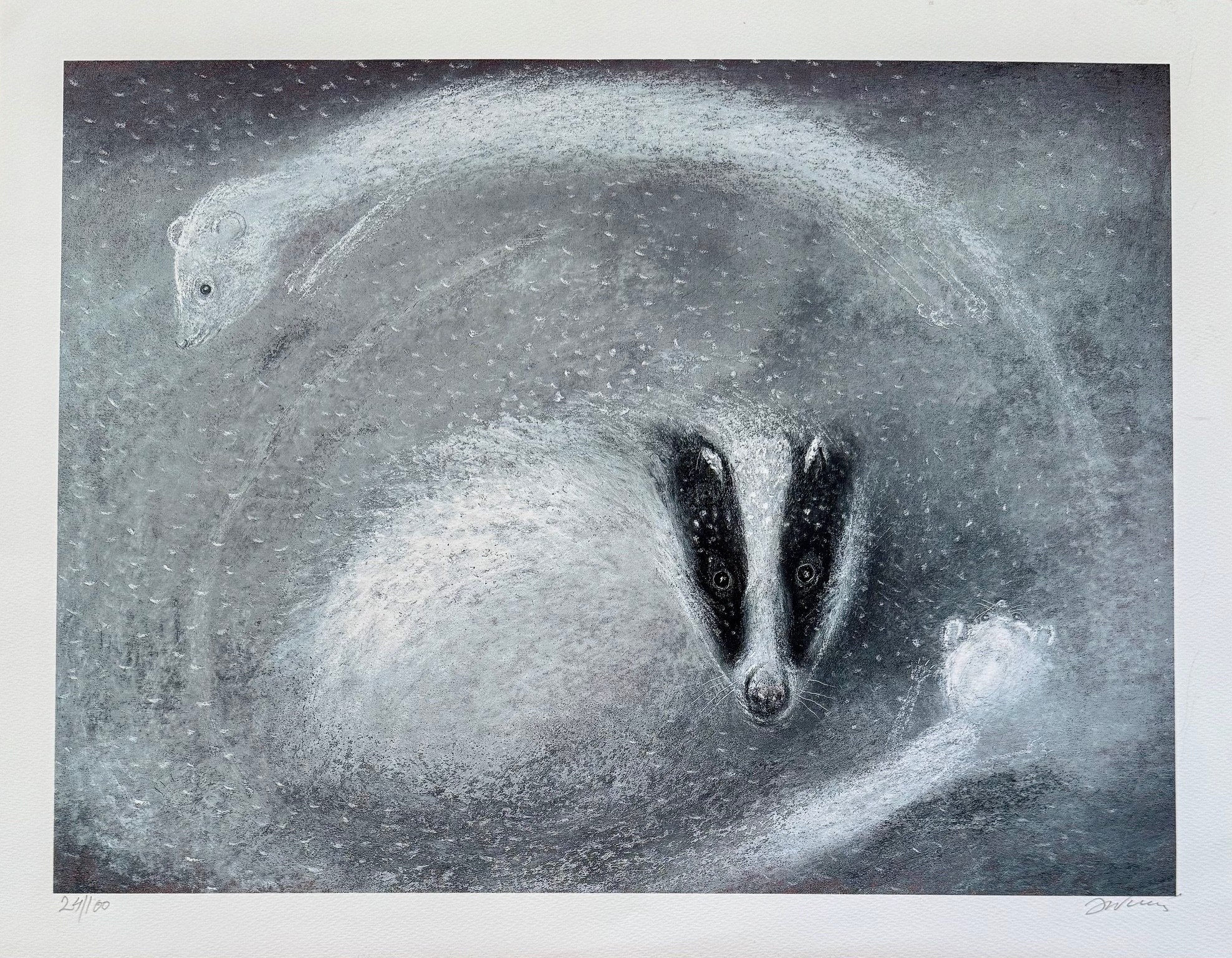 "Zima" - Limitowana inkografia z ilustracji do książki "Die vier Kinder ver Erde" Jacques Cassabois wydanej w języku niemieckim w 1992 r. Wielkość 49x37 cm w passe-partout. Data wykonania inkografii - 2022. Edycja numerowana: 100 szt. Podłoże: papier Somerset Enhanced Radiant White Velvet. Inkografia powstała za zgodą i pod nadzorem autora, jest ręcznie numerowana i sygnowana przez artystę. W passe-partout.