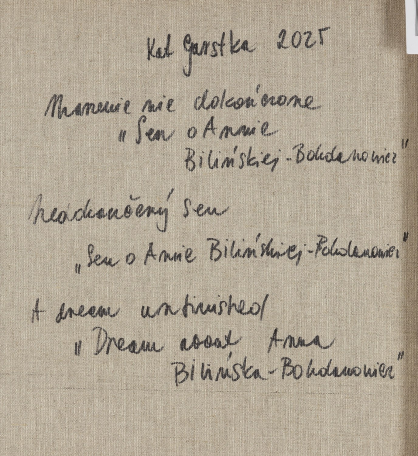 sygnowany, datowany i opisany na odwrociu: 'Kat Garstka 2025 | Marzenie nie dokończone "Sen o Annie | Bilińskiej-Bohdanowicz"'